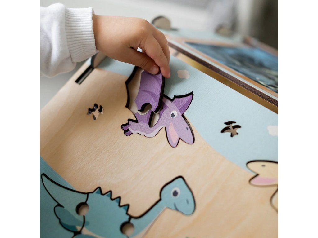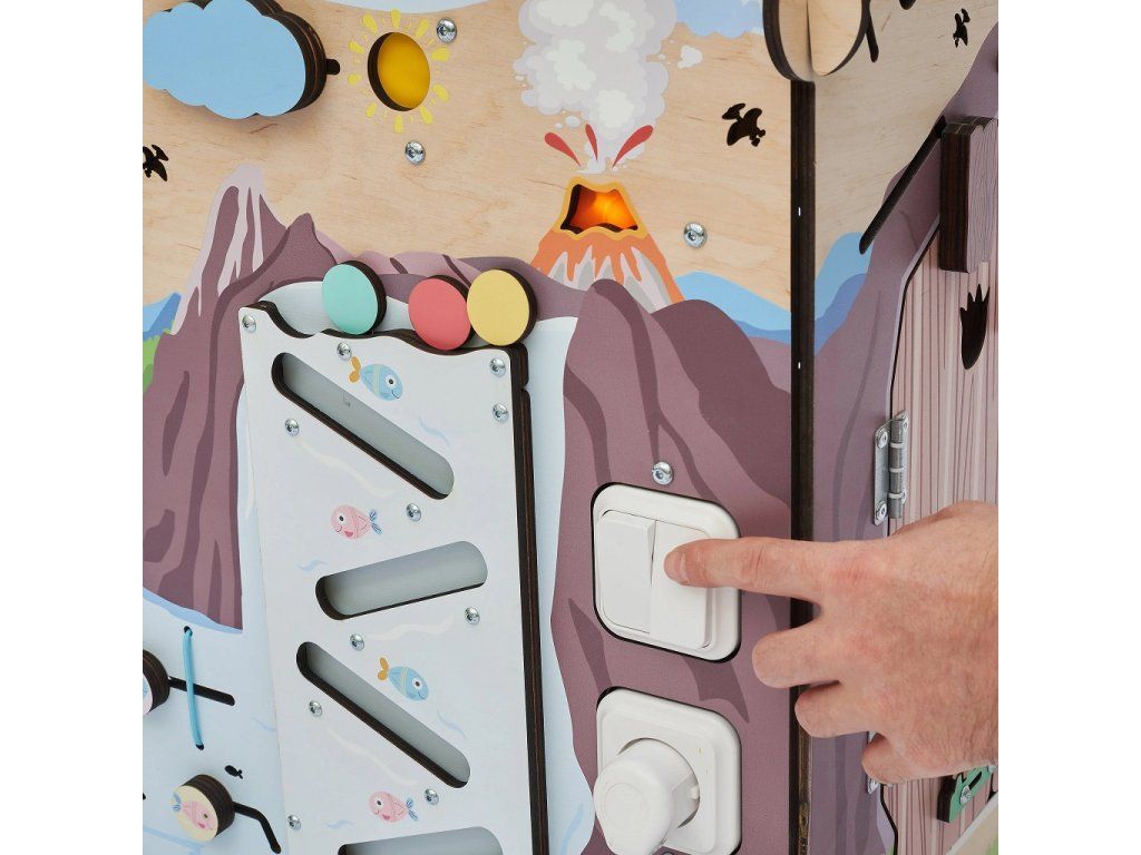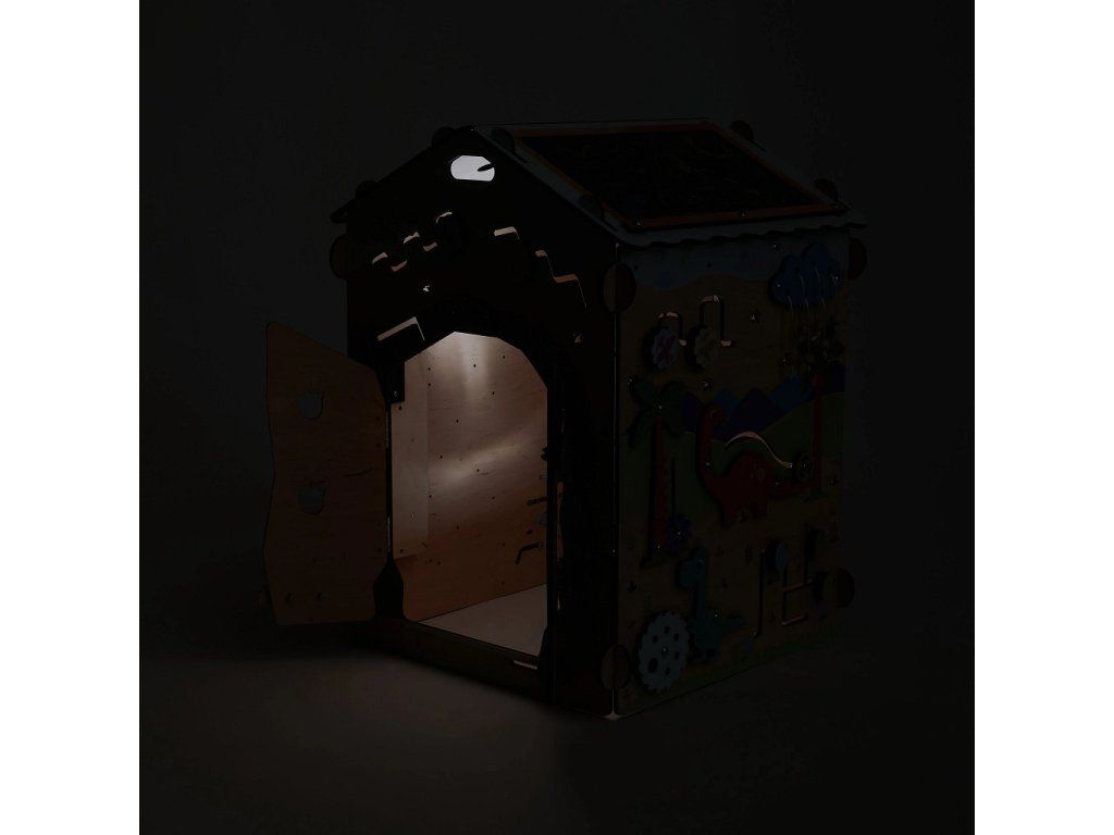 Niektoré prvky, ako sopka či slnko, sa dajú rozsvietiť, čo vytvára zaujímavú hernú atmosféru. Na streche sa nachádza tabuľa a vkladacie puzzle s dinosaurami, ktoré podporujú učenie a sústredenie.