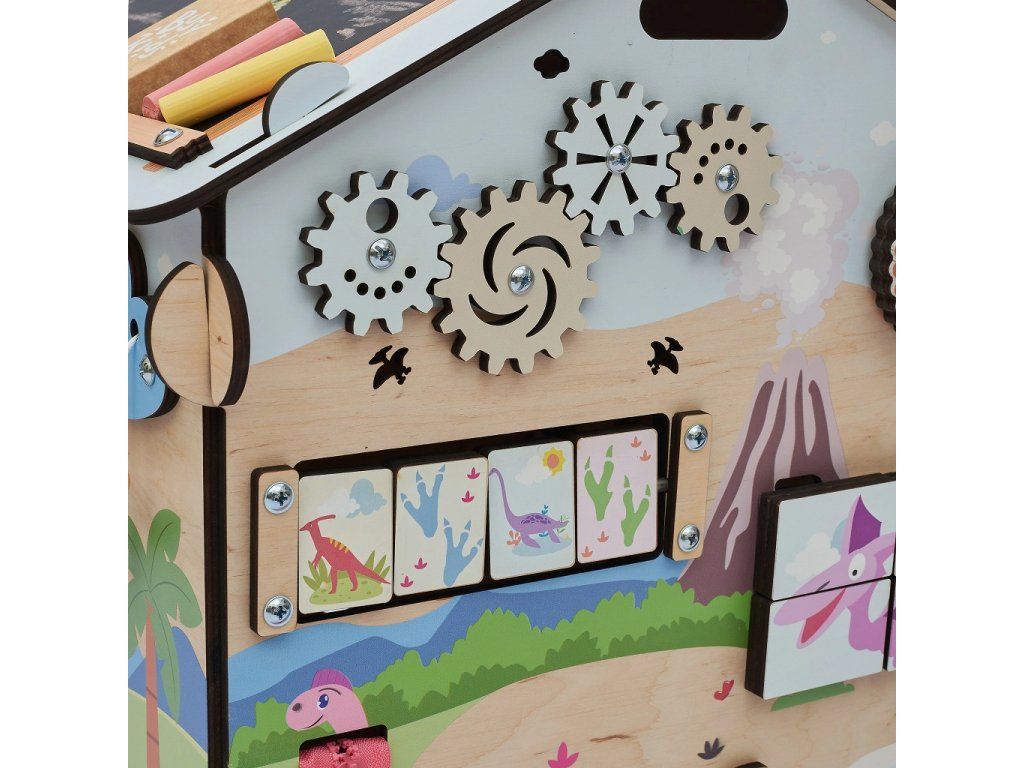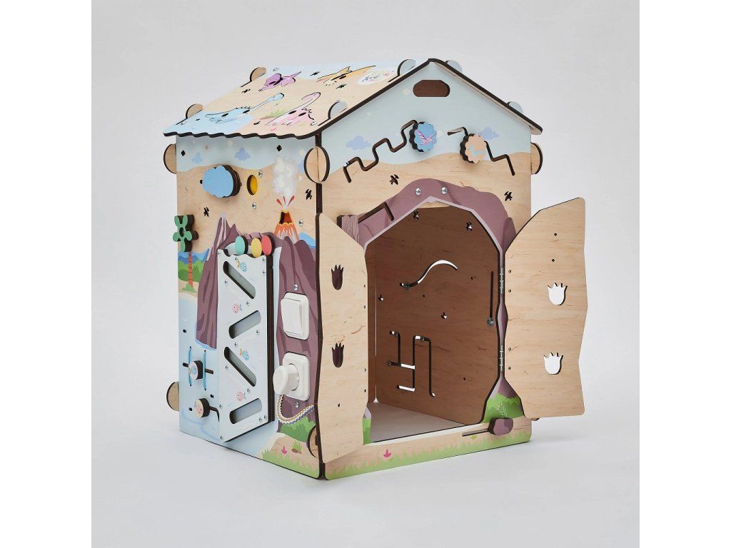 Domček s motívom dinosaurov ponúka viacero možností využitia – deti sa môžu schovávať, hrať sa na domček pre bábiky alebo garáž pre autíčka. Obsahuje približne 30 herných prvkov a 6 samostatných aktivít, ktoré možno používať jednotlivo alebo spolu.