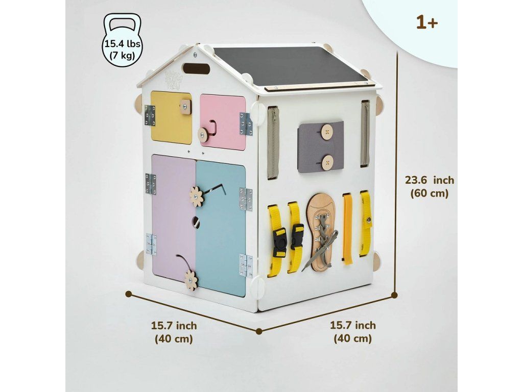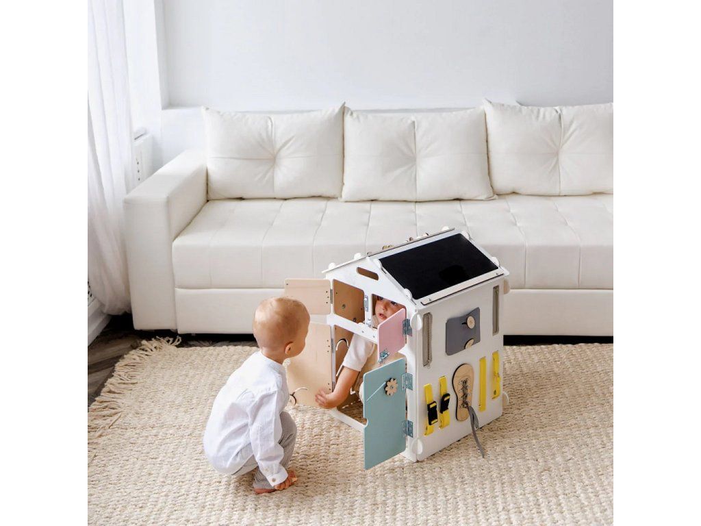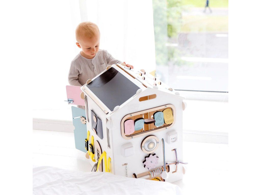 Hrací domček ponúka širokú škálu aktivít. Na streche sa nachádza tabuľa a vkladacie puzzle, na stenách nájdete zipsy, suchý zips, dotykovú lampu, budík, motorické prvky, tlačidlá, okná a dvere. Otváranie, zatváranie a vhadzovanie hračiek dovnútra aj von deti nesmierne baví. Vďaka interaktívnym prvkom domček podporuje rozvoj kreativity, zmyslového vnímania, logického myslenia a jemnej motoriky. Deti si zároveň trénujú koordináciu oko–ruka, sústredenie a trpezlivosť pri náročnejších aktivitách, ako je zapínanie gombíkov a tlačidiel.