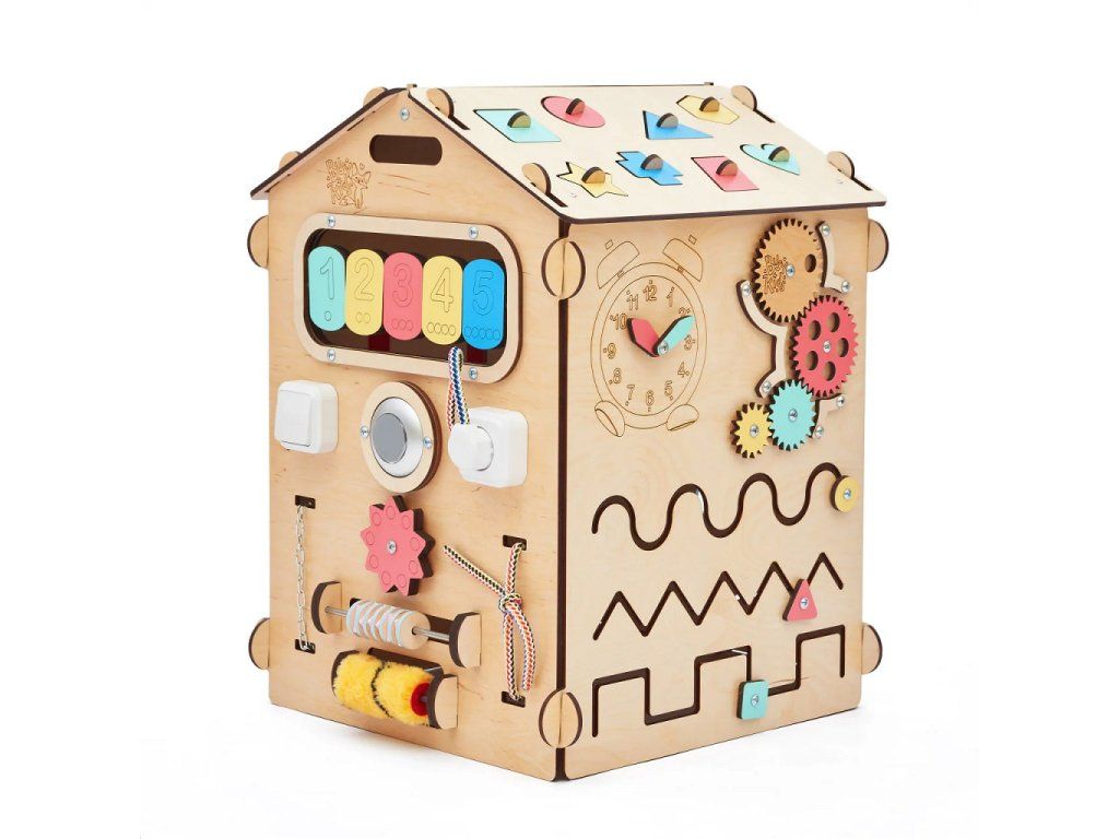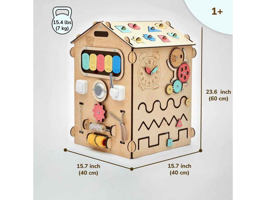 Hrací domček ponúka širokú škálu aktivít. Na streche sa nachádza tabuľa a vkladacie puzzle, na stenách nájdete zipsy, suchý zips, dotykovú lampu, budík, motorické prvky, tlačidlá, okná a dvere. Otváranie, zatváranie a vhadzovanie hračiek dovnútra aj von deti nesmierne baví. Vďaka interaktívnym prvkom domček podporuje rozvoj kreativity, zmyslového vnímania, logického myslenia a jemnej motoriky. Deti si zároveň trénujú koordináciu oko–ruka, sústredenie a trpezlivosť pri náročnejších aktivitách, ako je zapínanie gombíkov a tlačidiel.
