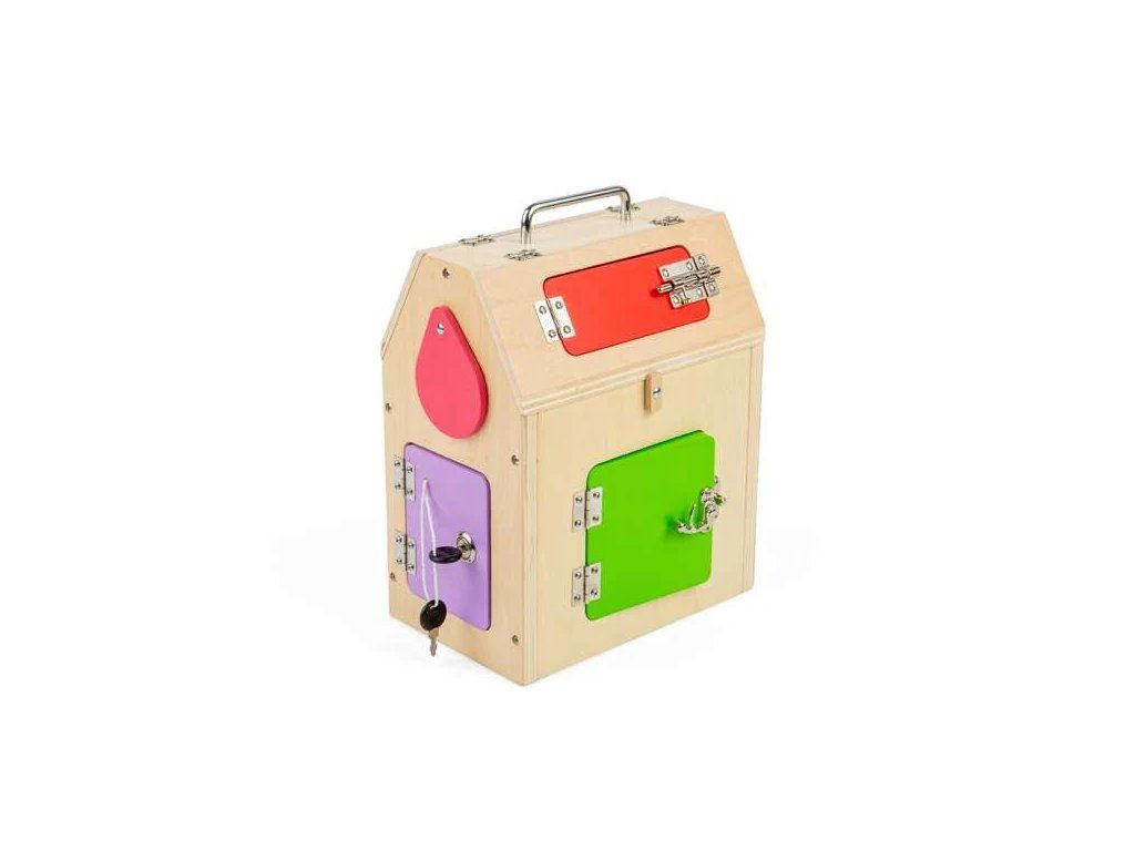 Rôzne zámky a labyrinty. Tento kufríkový domček prináša množstvo zábavy, vďaka ktorej môže vaše dieťa rozvíjať svoju zručnosť, zvedavosť a predovšetkým jemnú motoriku.