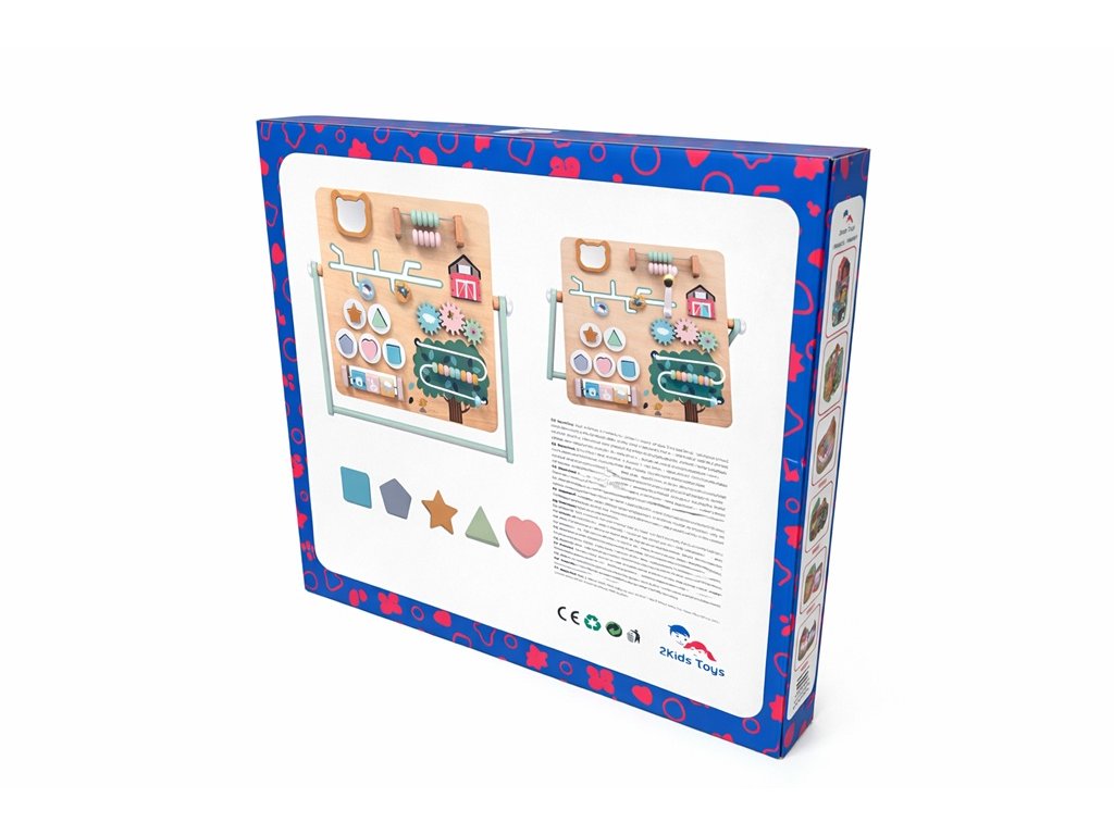 Drevená hracia doska ponúka bohatú škálu interaktívnych prvkov, ako sú otočné ozubené kolieska, posuvný a korálkový labyrint či vkladacie tvary. Všetky prvky motivujú deti k skúmaniu, učeniu a hre.