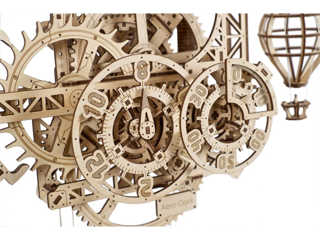 Aero Clock nie sú len drevený mechanický 3D model alebo pekná ozdoba. Ugears hodiny sú skutočné pracujúce hodiny, ktoré si môžete sami zostaviť, zavesiť na stenu, natiahnuť a sledovať, ako ubiehajú sekundy, minúty a hodiny. Aero Clock predstavuje geniálny puzzle a mechanizmus hodín DIY, ktorý sa líši od akýchkoľvek iných hodín. Je to krásny kúsok precízneho inžinierstva, ktorý odhaľuje fungovanie hodín s kyvadlom s hmotnostným závažím každému, kto hodiny skladá a obdivuje. Ako všetky modely Ugears, má aj ten "extra šmrnc", ktorým dokáže očariť a zaujať našu rastúcu skupinu fanúšikov.
