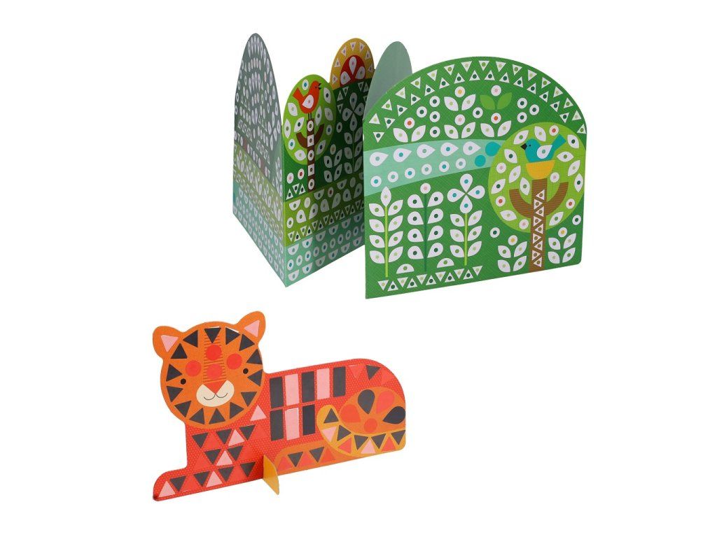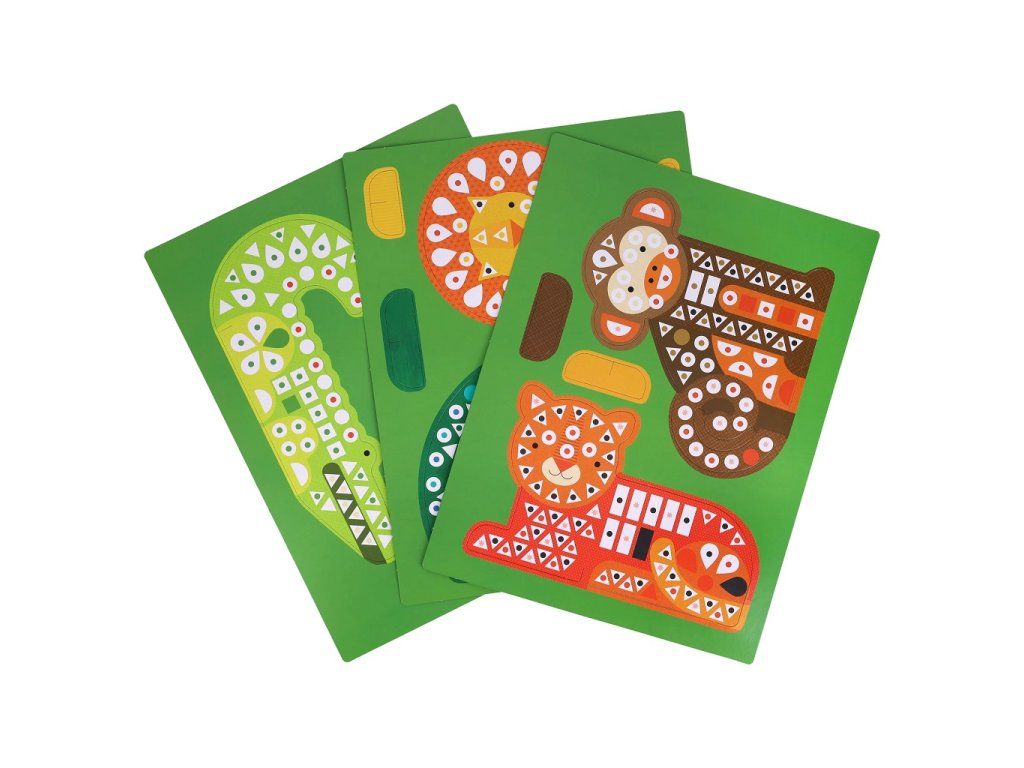 Ale čo by to bolo za divočinu bez zvierat? Spojte farby bodiek s farbami samolepiek a dokončite šesť postáv: tigra, krokodíla, opicu, páva, sovu a leva. Keď sú zvieratá aj scéna hotové, usporiadajte pred obojstranným pozadím divadlo a vdýchnite svojmu umeleckému dielu život.