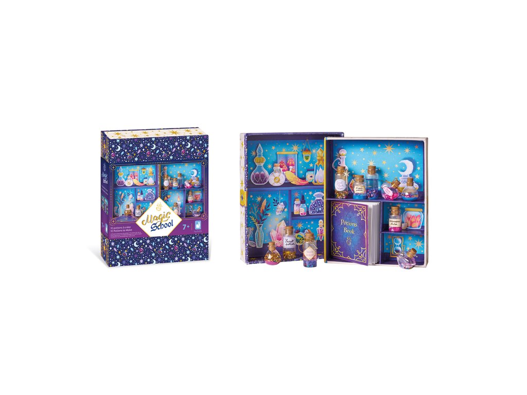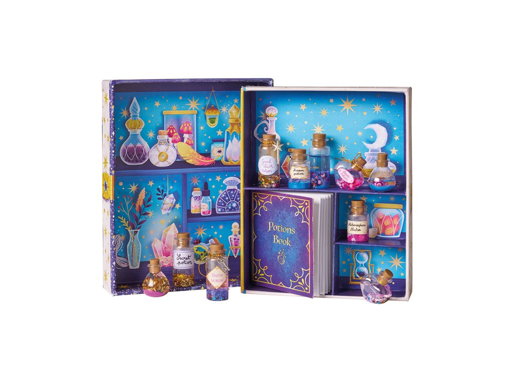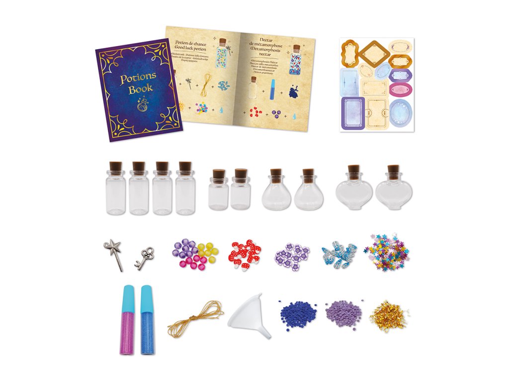 Kreatívna sada – čarovné elixíry!Štipka hviezd, štipka flitrov, dotyk perál! Táto kreatívna sada umožňuje deťom vyrobiť si vlastné čarovné elixíry v malých fľaštičkách s použitím množstva ingrediencií a knihy kúziel s magickými receptami. Aktivita rozvíja kreativitu, trpezlivosť a jemnú motoriku. Jeden elixír sa dá pripraviť približne za 5 minút a sada je vhodná pre deti od 7 rokov.