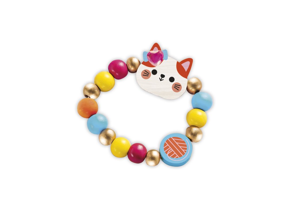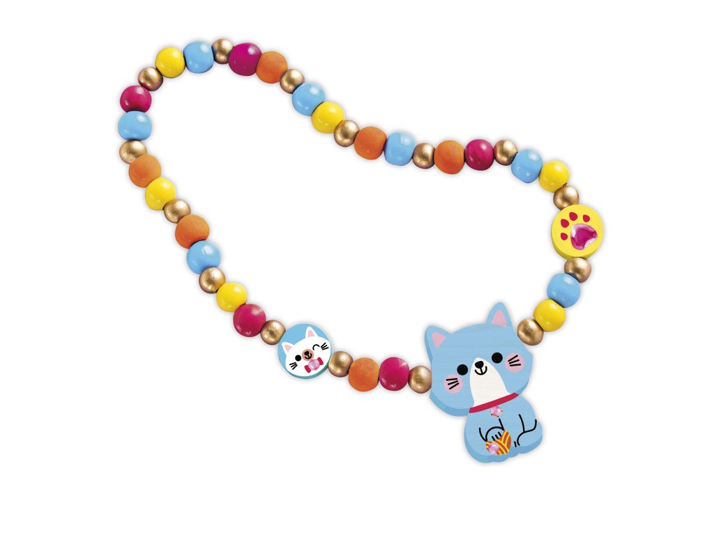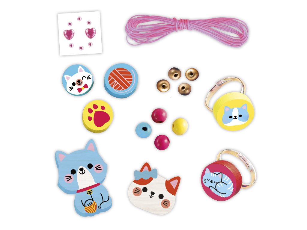 Mňauuuuu! Vytvorte si vlastnú sadu drevených šperkov! Z tejto sady si môžete vyrobiť 1 náhrdelník, 1 náramok a 2 prstene, pričom všetky majú mačiatka.