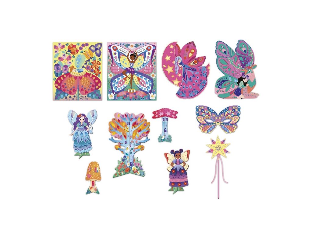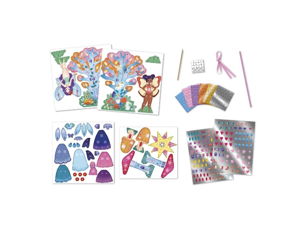 Objavte rozprávkový svet malých víl! Z obsahu tejto pevnej krabičky s krásnou potlačou môžete vytvoriť rôzne dekorácie: mozaikové obrázky, 3D víly, masku, čarovnú paličku, vyškrabkať obrázok, 2 hríbiky a 3D stromček.