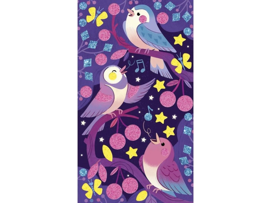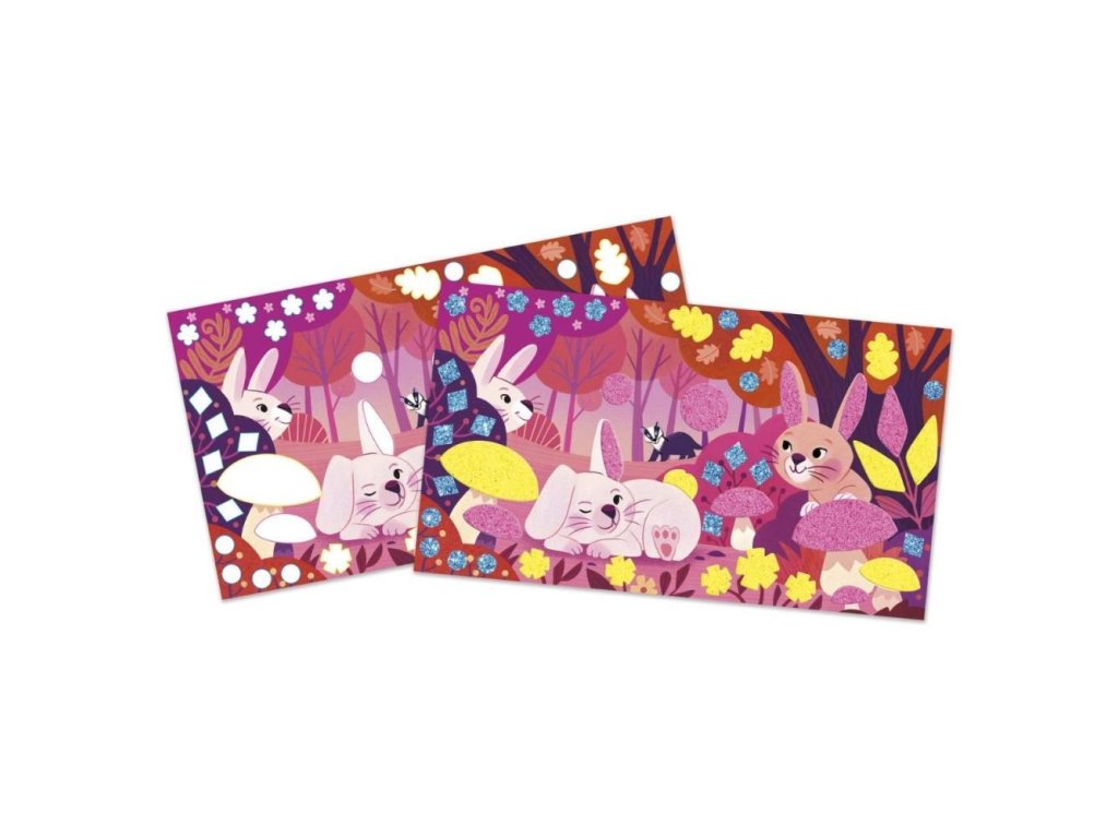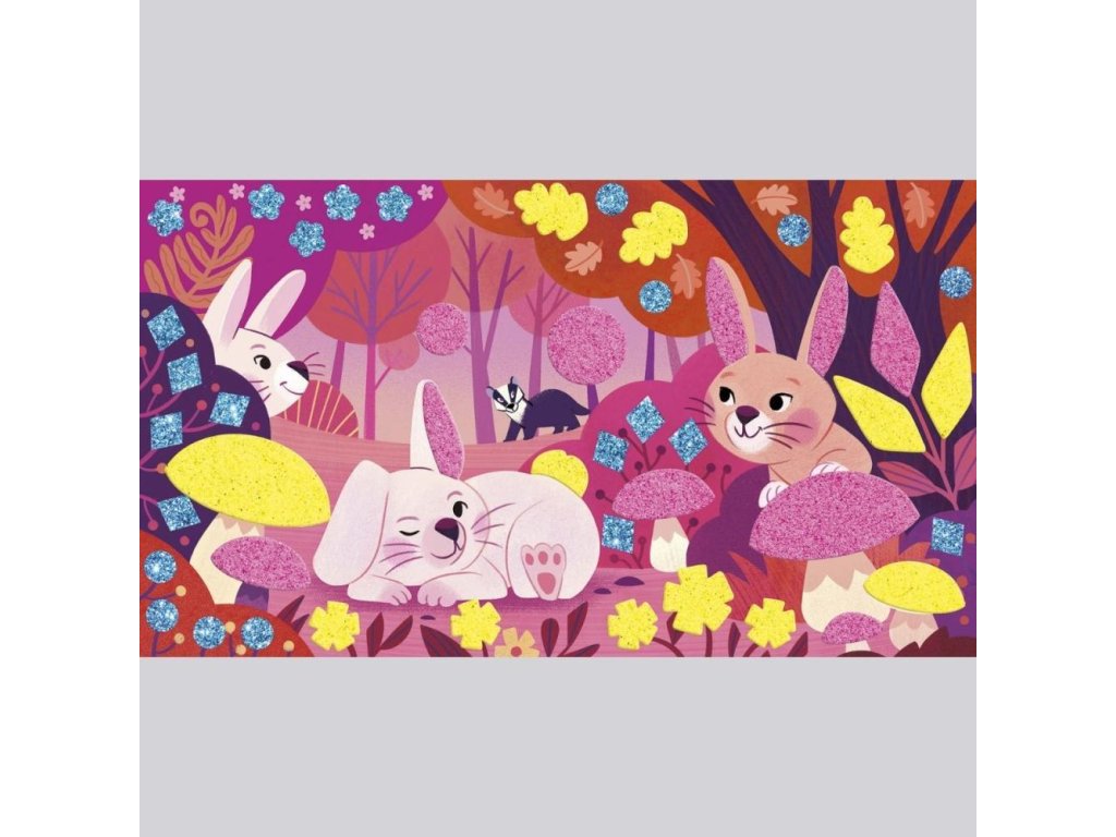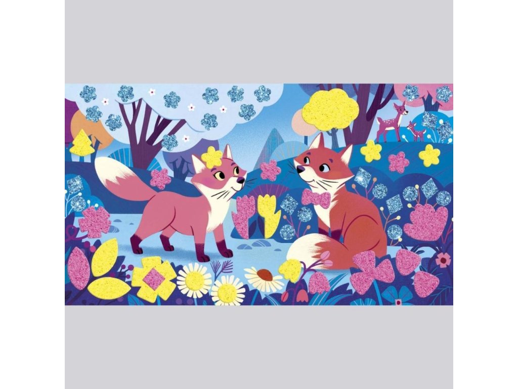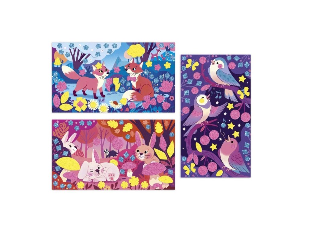 Objavte čarovný svet lesných zvieratiek! Obsahuje 3 dosky-obrázky (20,7 x 11,8 cm), zobrazujúce stretnutie lesných zvieratiek. Ilustrácie je možné na vhodných miestach ozdobiť fluorescenčným pieskom (ružovým alebo žltým) a penovými nálepkami. Zdobenie pieskom a nalepovanie ponúka deťom hodiny pútavej, upokojujúcej a tvorivej zábavy a hotové obrázky sa stanú skvelým dekoratívnym prvkom detskej izby.