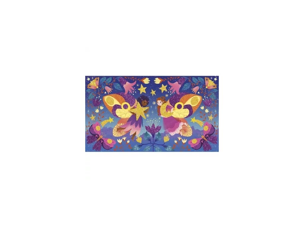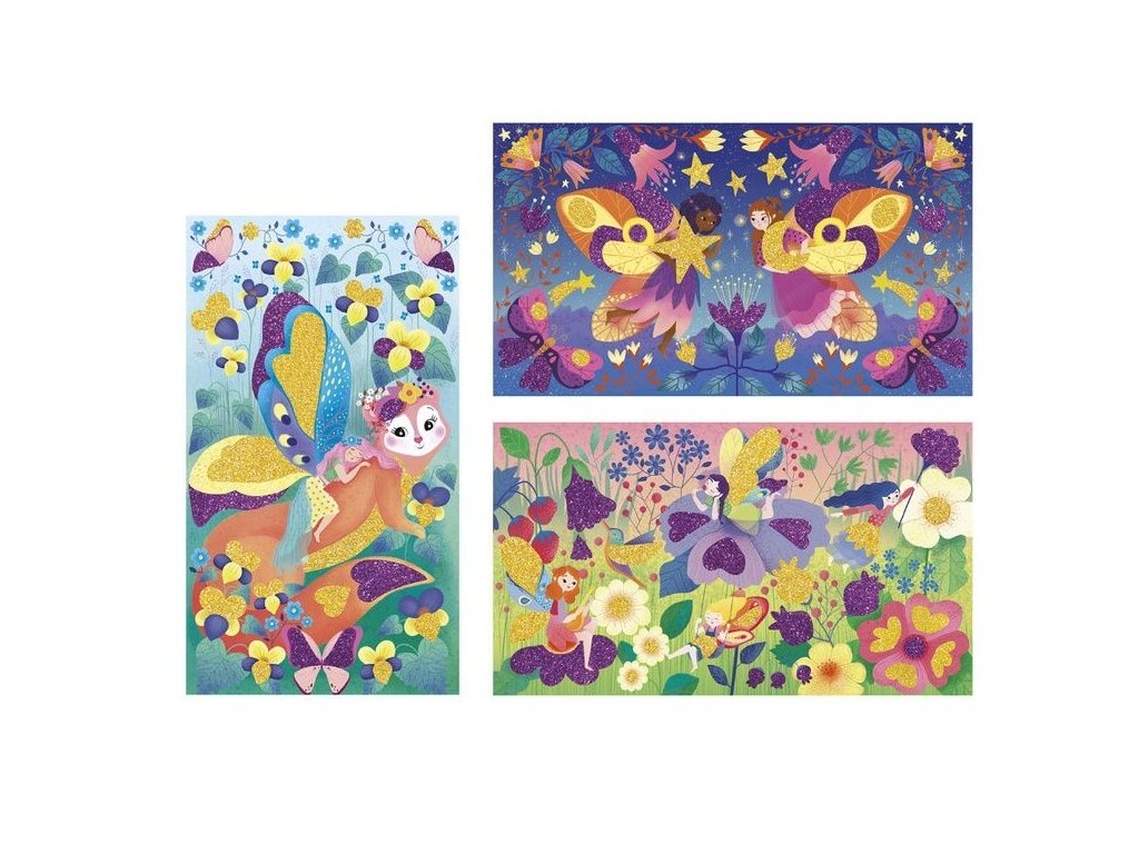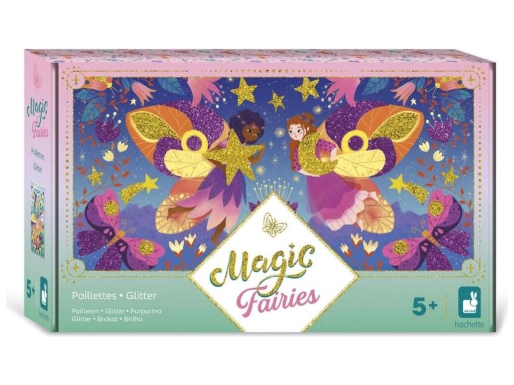 Kreatívna sada Magic Glitter Fairies francúzskej značky JANOD obsahuje 3 obrázkové tabule so samolepiacim náterom, zobrazujúce rozprávkový svet víl. Tieto ilustrácie je možné posypať – na určené miesta – trblietkami v tubách, ktoré sú súčasťou sady, v 2 farbách: zlatá a tmavoružová. Súčasťou sady je aj drevená stierka na odkrývanie plôch určených na zdobenie a rovnomerné rozmiestnenie trblietok. Zdobenie drobnými prvkami znamená pre dieťa dlhé hodiny pútavej a zároveň upokojujúcej hry a hotové obrázky sa stanú nádherným dekoračným prvkom detskej izby.