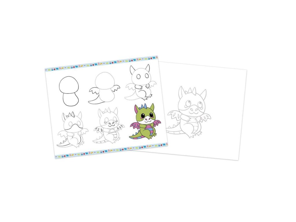 Sada obsahuje vzory zvieratiek, dinosaurov a roztomilých motívov v štýle kawaii, ktoré deti milujú. Hotové kresby si môžu deti opakovane precvičovať na priložených čistých listoch a následne ich vyfarbovať trblietavými fixkami. Táto aktivita poskytuje dlhé hodiny pútavej, pokojnej a zároveň rozvíjajúcej zábavy. Výsledné obrázky sa môžu stať krásnou dekoráciou detskej izby a zdrojom hrdosti pre malých umelcov.