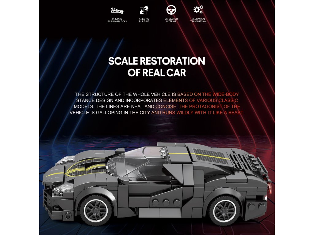 Čierna karoséria so žltými detailmi, výrazné aerodynamické línie a realistické spracovanie dodávajú stavebnici autentický vzhľad jedného z najexkluzívnejších superšportov sveta. S viac ako 330 dielikmi ponúka ideálnu kombináciu zábavy pri skladaní, detailného spracovania a elegantného výsledného modelu. Perfektná voľba pre zberateľov aj fanúšikov automobilových legiend.