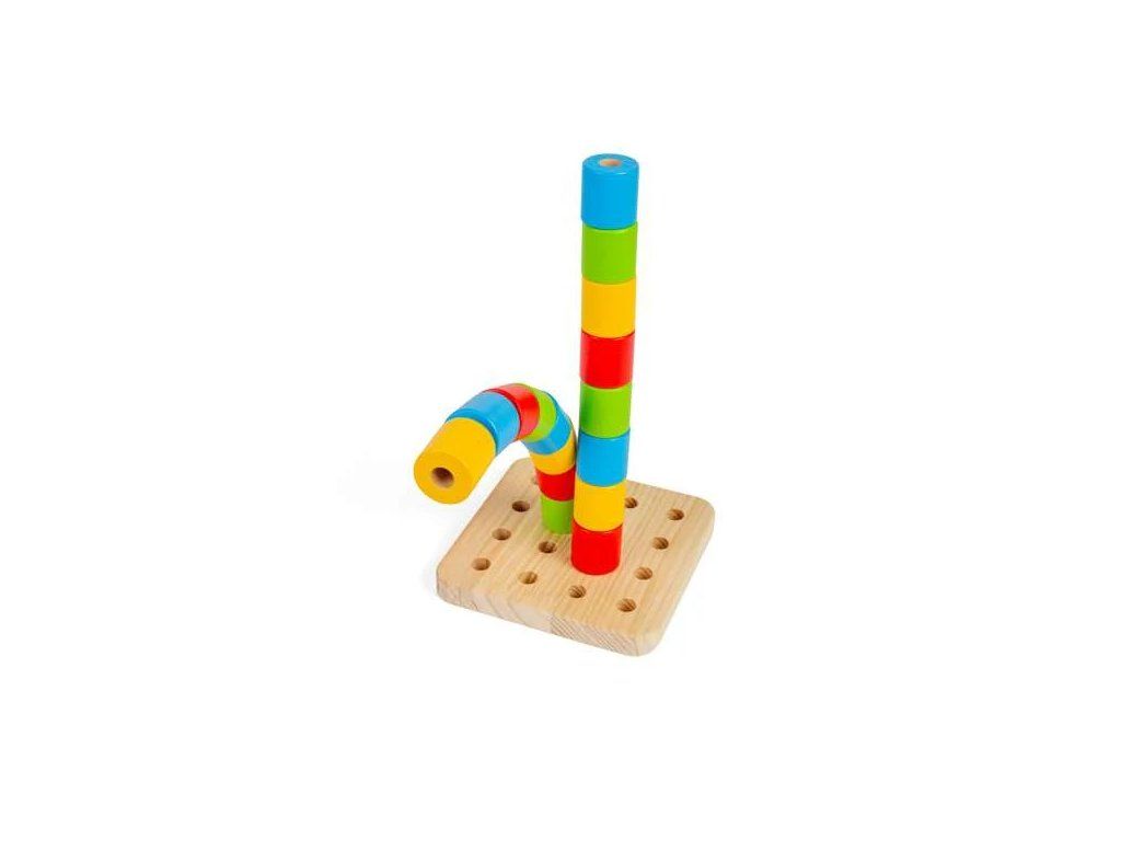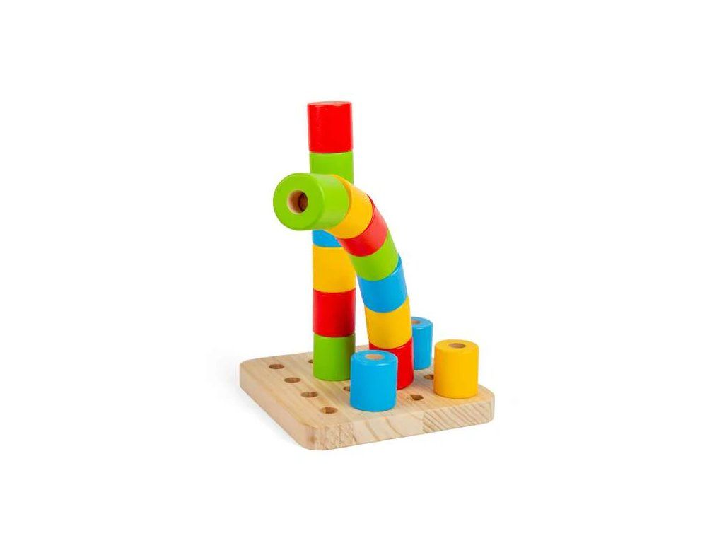 Sada obsahuje 16 pestrofarebných valčekov s kolíčkami vo vnútri, ktoré je možné naskladať na drevený podstavec a vytvoriť rôzne vysoké kývajúce sa veže. Hra pomáha deťom rozvíjať obratnosť, priestorové uvažovanie a koordináciu ruka-oko. Deti sa učia vyrovnávať jednotlivé dieliky a pracovať s rovnováhou, pričom hravé kývanie robí každý pokus o skladanie zábavným zážitkom z učenia.