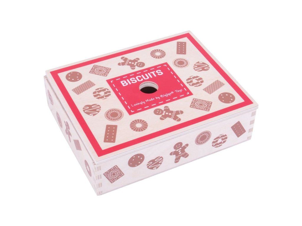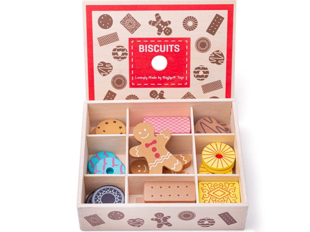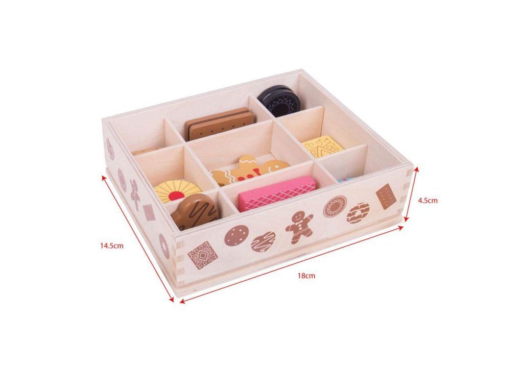 Táto drevená krabička na sušienky je plná lahodne vyzerajúcich drevených dobrôt. Zahrňuje sortiment sušienok, ktoré každý miluje, vrátane perníčkov, laskoniek a ďalších. Odpoledňajší čajový dýchánok môže začať! Tento skvelý box na cukrovinky pomáha vášmu dieťaťu dozvedieť sa viac o dôležitosti zdravej a vyváženej stravy, odkiaľ naše jedlo pochádza a ako sa pripravuje.