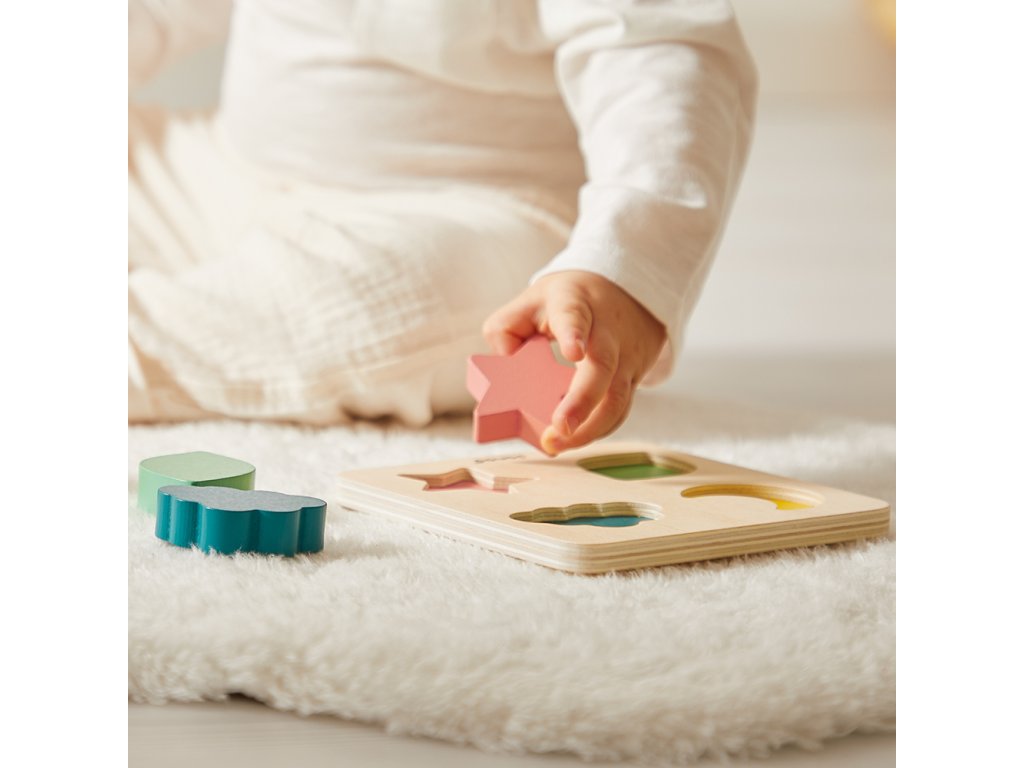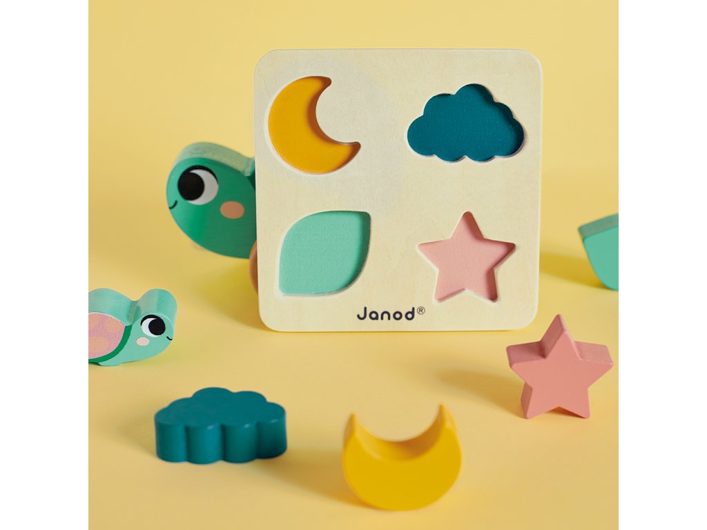 - Drevené puzzle – 4 dieliky rôznych tvarov a farieb na rozvoj logického myslenia, motoriky a slovnej zásoby.