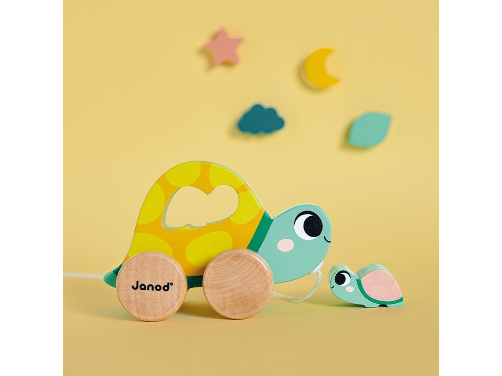 - Drevená ťahacia korytnačka – podporuje prvé kroky dieťaťa, figúrku možno viesť dvoma spôsobmi (ťahaním na šnúrke alebo držaním za krunier).