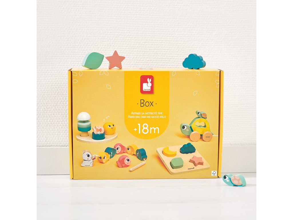 Janod Box – box s hračkami pre rozvoj jemnej motoriky (18+ mesiacov)Janod Box je starostlivo navrhnutá sada drevených hračiek určená pre deti od 18 mesiacov. Vznikla v spolupráci s psychomotorickým terapeutom, aby rešpektovala prirodzené tempo vývoja dieťaťa a podporovala jeho motorické, zmyslové a kognitívne schopnosti.