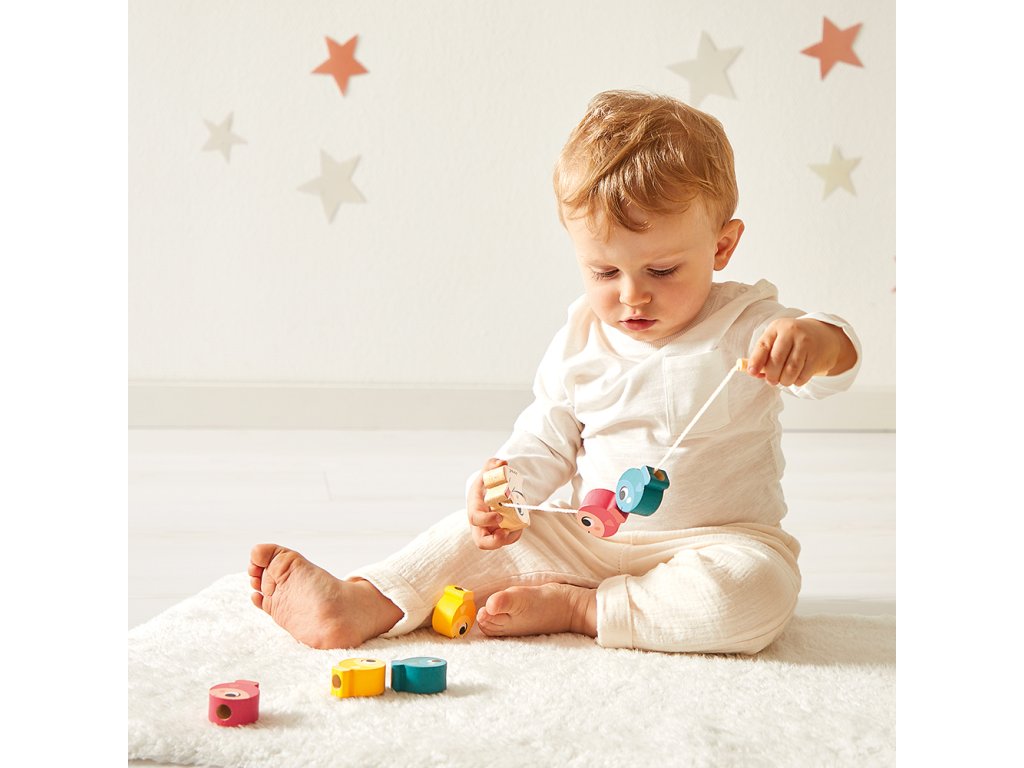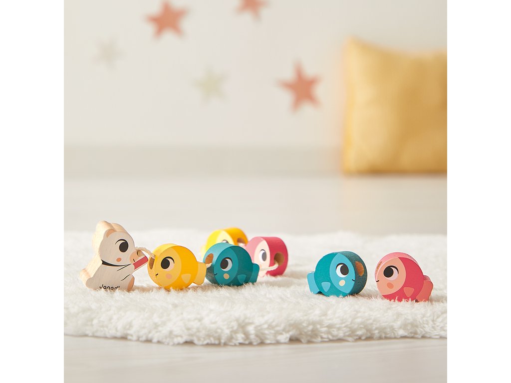 - Navliekacie guľôčky v tvare rybky – 6 drevených dielikov na rozvoj jemnej motoriky a koordinácie oko–ruka.