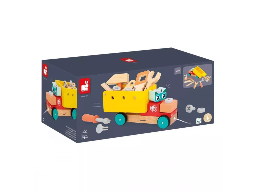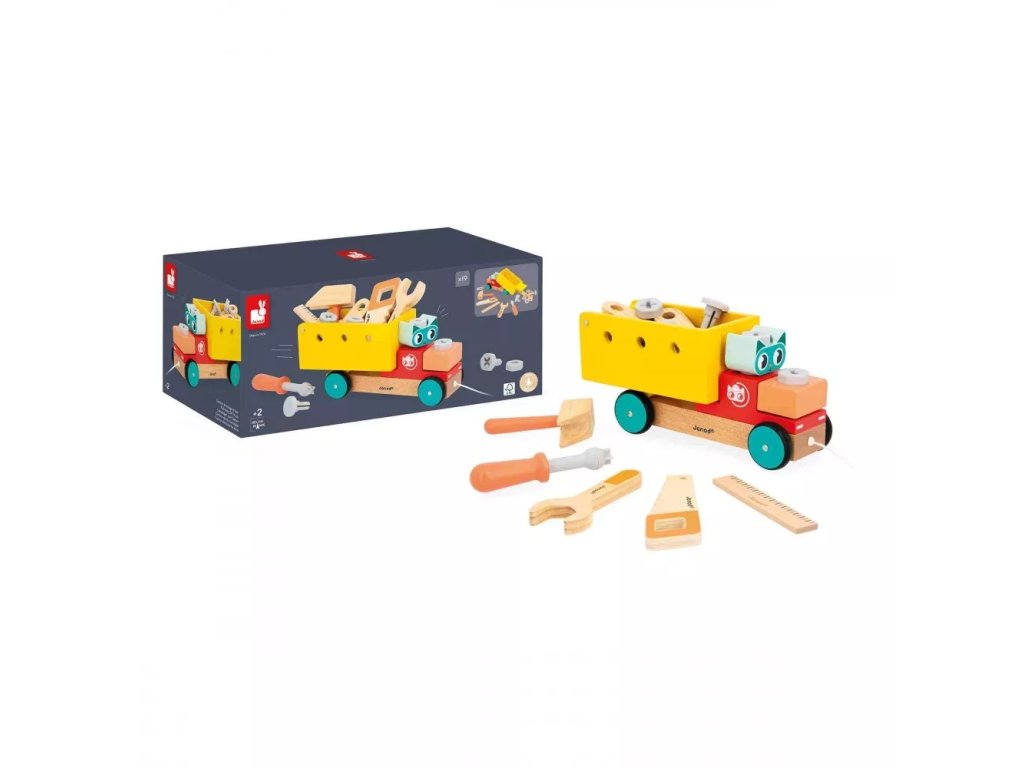 Kamión je vybavený zdvíhacím návesom, množstvom drevených a plastových doplnkov a sadou nástrojov, vďaka ktorým môžu deti skrutkovať, búchať, merať aj „píliť“. Špeciálne skrutky so zárezom pridávajú hre ďalšiu výzvu a rozširujú možnosti kreatívnej hry.
