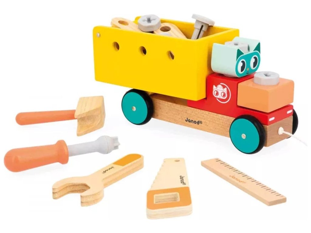 Ťahací kamión pre domácich majstrov 2 v 1 Brico'Kids – Janod (2+)Pozor, kamión pre domácich majstrov je na ceste! Tento originálny ťahací vozík 2 v 1 z kolekcie Brico'Kids od značky Janod spája prvé krôčiky dieťaťa s tvorivou konštrukčnou hrou. Vďaka šnúrke na ťahanie pomáha rozvíjať chôdzu a stabilitu, zatiaľ čo bohaté príslušenstvo podporuje jemnú motoriku, zručnosť a predstavivosť.