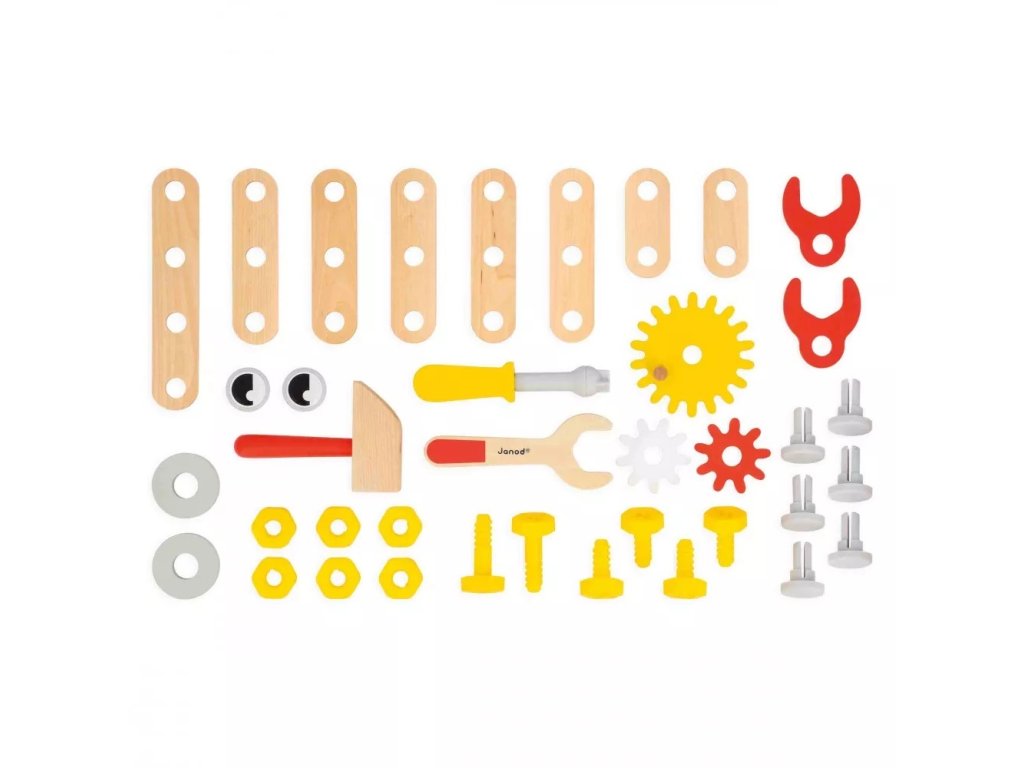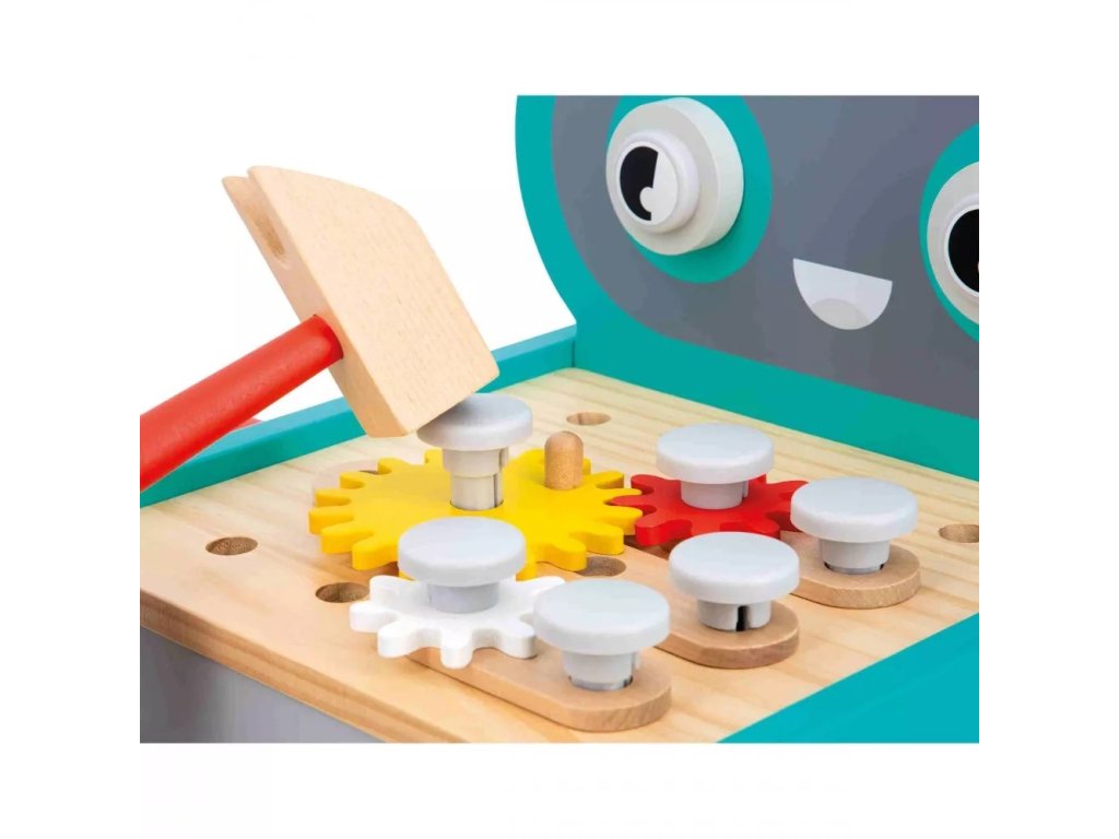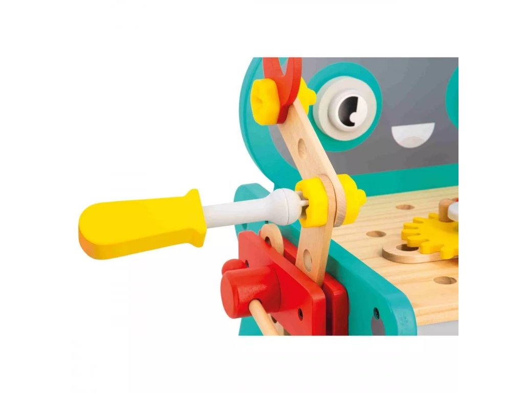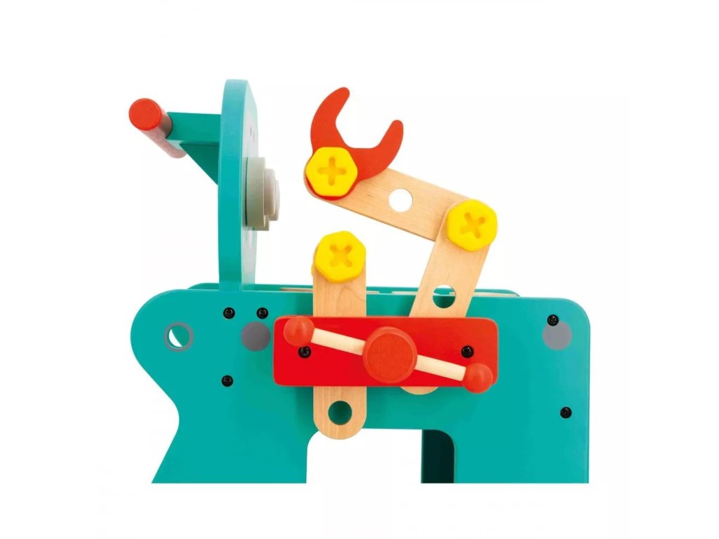 Vozík je vybavený zverákom a praktickým systémom drevených magnetických nástrojov na jednoduché uloženie v prednej časti. Deti môžu skrutkovať, skladať a experimentovať s doplnkami podľa vlastného nápadu, čo podporuje predstavivosť, koordináciu a manuálne zručnosti.