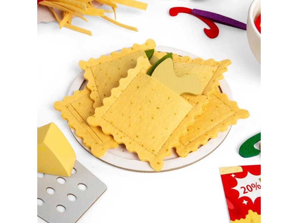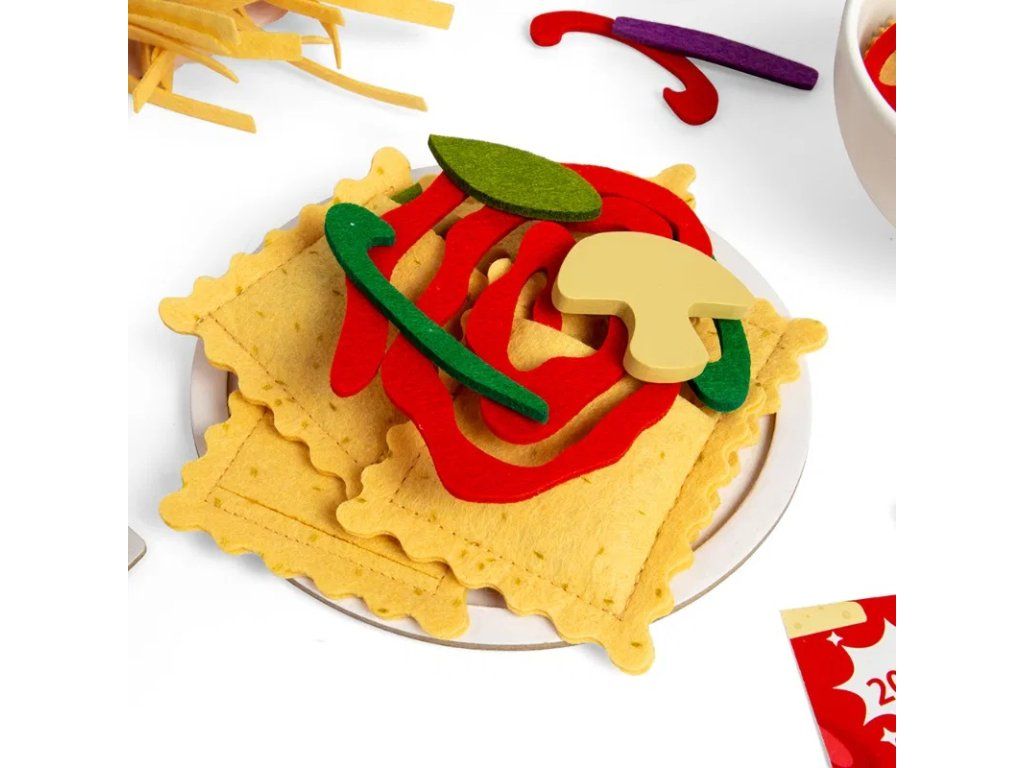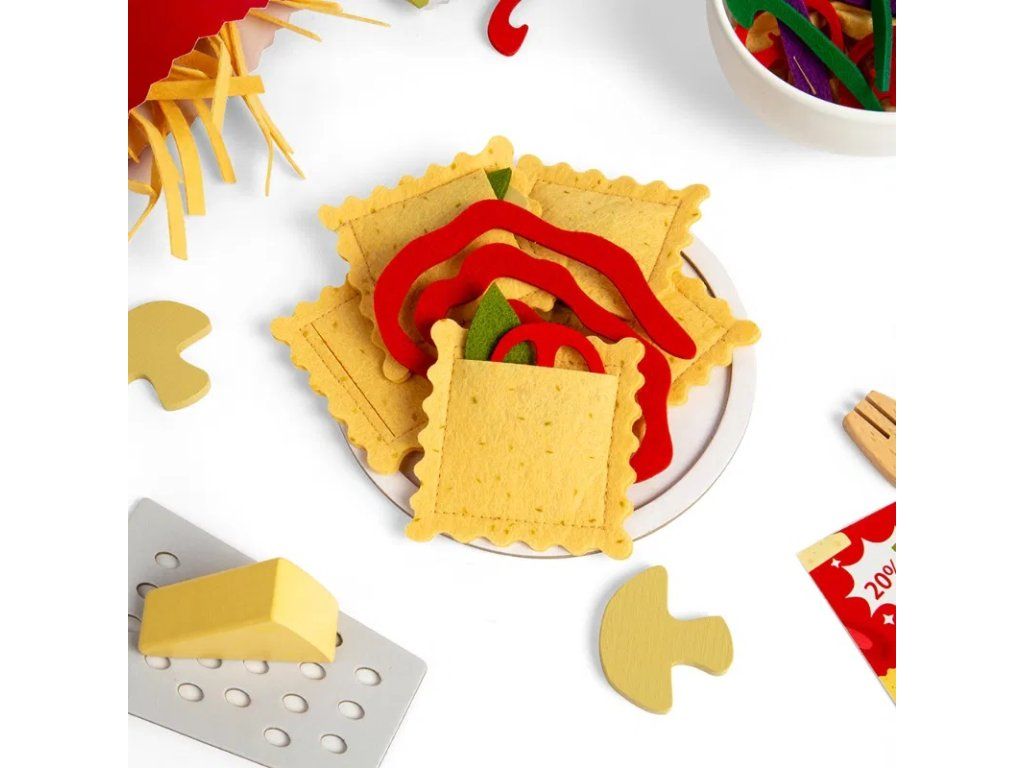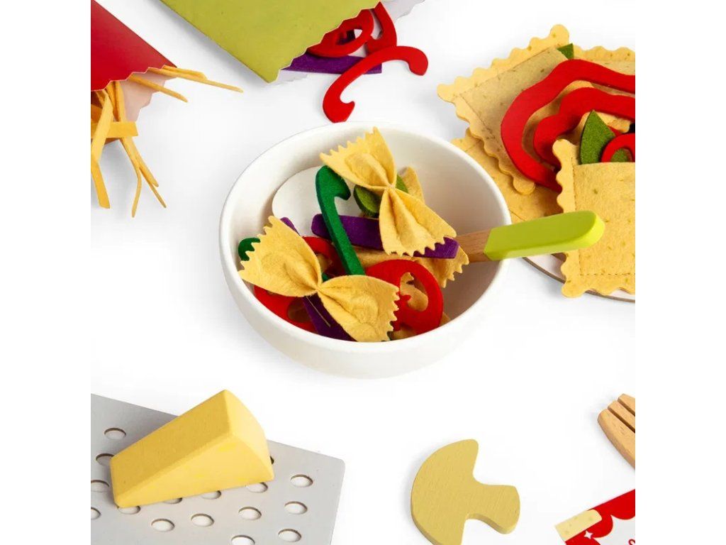Sada obsahuje drevenú misku a tanier, dve vidličky, strúhadlo na syr s plátkom parmezánu, ako aj mäkké plstené ingrediencie, napríklad tagliatelle, ravioli či farfalle. Nechýbajú ani rôzne druhy farebnej zeleniny, paradajková omáčka, huby alebo lístky bazalky. Súčasťou balenia je aj karta s talianskym menu, ktorá dodáva hre autentický reštauračný zážitok.