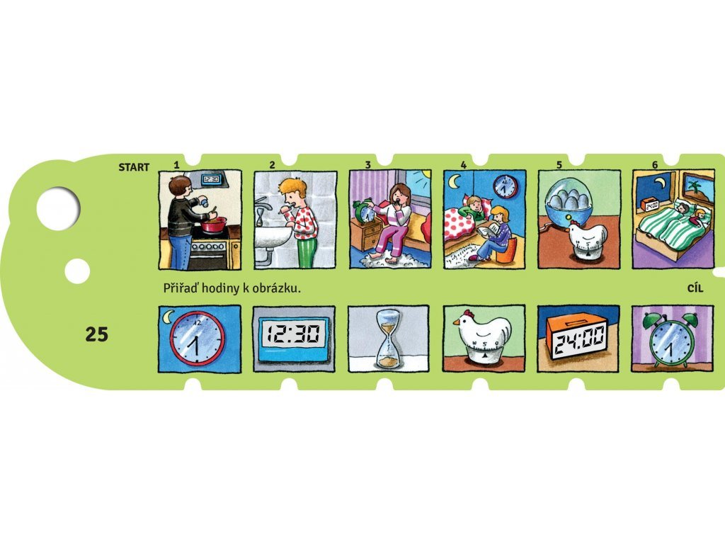 Vieš sa orientovať v čase? Vieš správne spojiť digitálny a ručičkový ciferník? Hľadaj odpovede na 180 otázok – a správnosť odpovede si sám skontroluj. Ideálna výuková hra, pri ktorej sa dieťa učí systematicky priraďovať, porovnávať, počítať a hľadať rovnaké rozdiely alebo chyby.