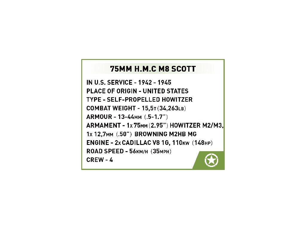 Postavte si model M8 Scott, samohybnej húfnice z 2. svetovej vojny v mierke 1:35. Tento model je založený na podvozku ľahkého tanku Stuart a niekedy sa označuje aj ako M8 Generál Scott. Vozidlo bolo vyzbrojené 75 mm húfnicou umiestnenou v otvorenej veži a zváraný pancier chránil posádku. Od septembra 1942 do januára 1944 bolo vyrobených približne 1 778 vozidiel tohto typu.