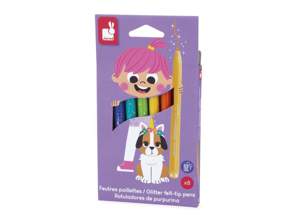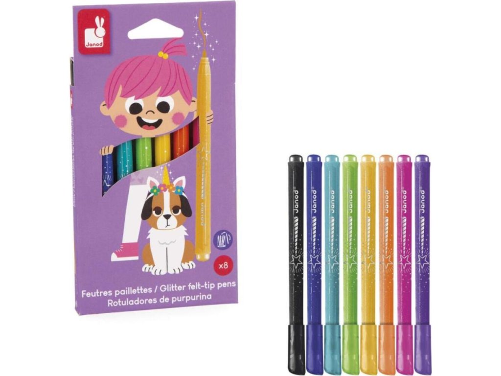 Sada 8 trblietavých fixiek Janod – kolekcia Colo (3+)Dodajte kresbám iskru! Táto sada 8 trblietavých plstených fixiek je ideálna pre deti od 3 rokov a ponúka jasné farby s nádychom trblietok, ktoré dodajú kresbám a výtvorom úžasný efekt. Vysoká hustota trblietok zabezpečuje magický vzhľad hneď po nanesení na papier.