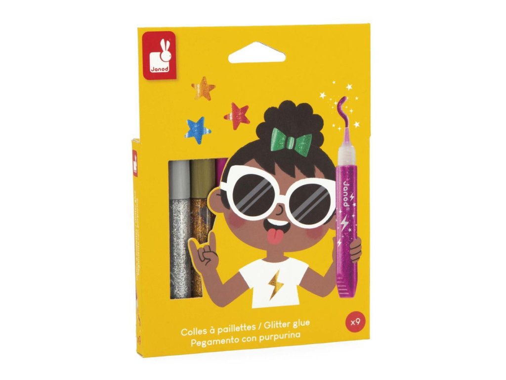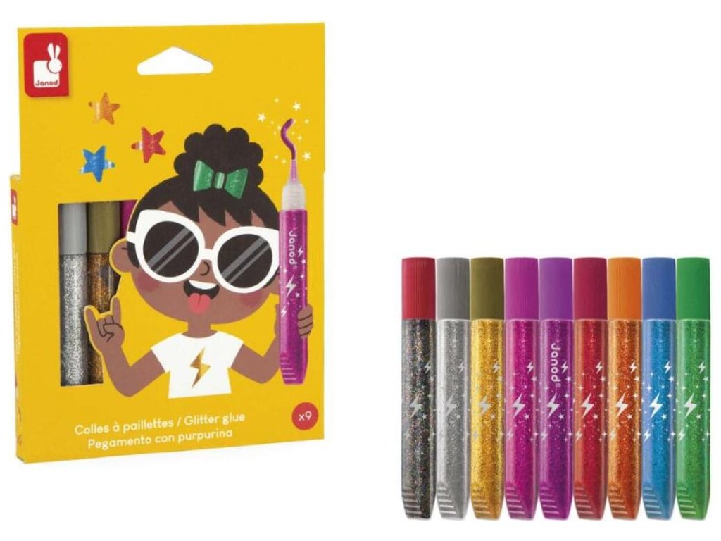 Sada 9 trblietavých lepidiel Janod – kolekcia Colo (3+)Vytvorte farebnú dúhu! Táto sada 9 trblietavých lepidiel je vhodná pre deti od 3 rokov a umožňuje jednoduché pridávanie trblietok do každého výtvoru. Mäkké telo lepidla zabezpečuje pohodlné nanášanie a presná špička umožňuje kreslenie, farbenie a zvýrazňovanie línií.