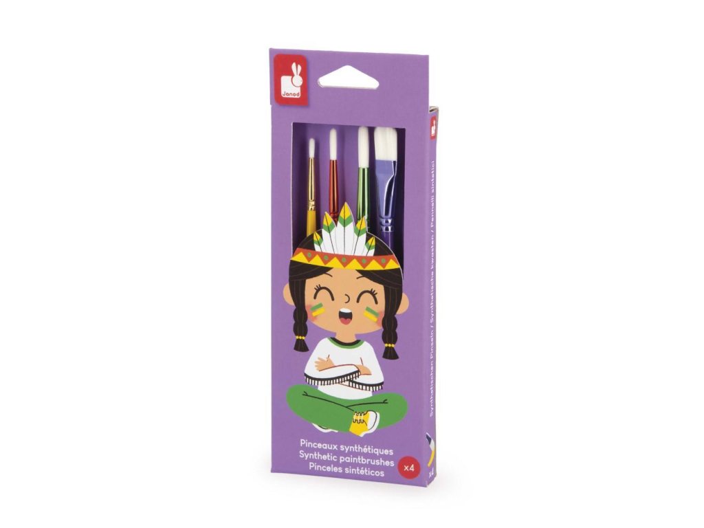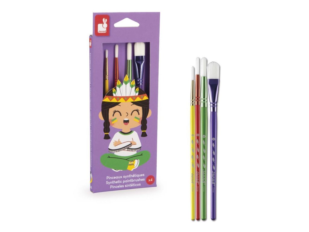 Sada 4 štetcov Janod – kolekcia Colo (3+)Táto sada 4 štetcov je ideálna na zoznámenie detí od 3 rokov s radosťou z kreslenia a maľovania. Štetce majú rôzne tvary a veľkosti, ktoré umožňujú používať rozmanité maliarske techniky a stimulovať kreativitu a predstavivosť malých umelcov.