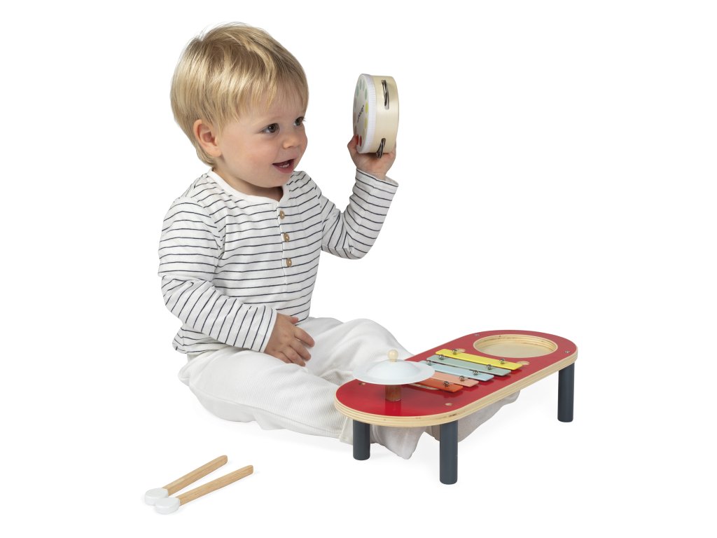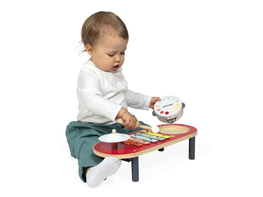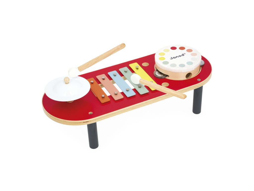 Farebný hudobný stolík Janod – bubon, činel a xylofón (18+ mesiacov)Koncert sa môže začať! S týmto farebným hudobným stolíkom si najmenší môžu vymýšľať svoju prvú hudbu. Stolík obsahuje činel, bubon a xylofón, takže deti môžu experimentovať s rôznymi zvukmi a rytmom. Praktické: paličky sa dajú pohodlne uložiť do otvorov na stole, aby sa neztratili.