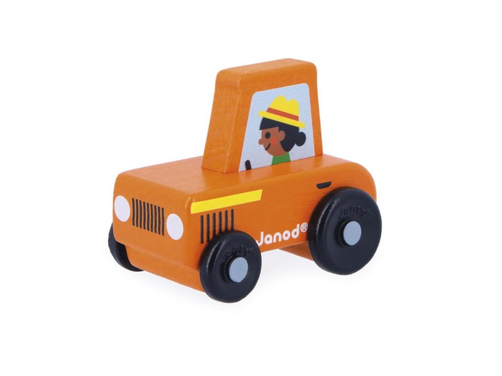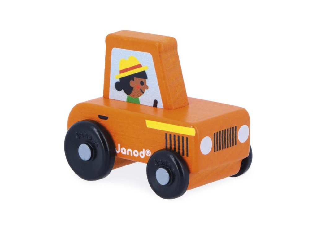 Drevený červený traktor – JanodMalý drevený traktor, s ktorým sa deti ľahko hrajú a rozvíjajú svoju predstavivosť a jemnú motoriku. Farmárova manželka so svojím červeným traktorom vyráža na polia, aby sa starala o úrodu! Tento ergonomicky tvarovaný traktor umožňuje malým rúčkam pohodlné uchopenie a kotúľanie vozidla.