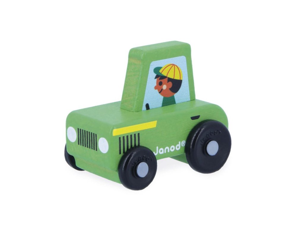Drevený traktor – JanodMalý drevený traktor, s ktorým sa deti ľahko hrajú a rozvíjajú svoju predstavivosť a jemnú motoriku. Farmár so svojím zeleným traktorom vyráža na lúky zbierať balíky slamy! Tento ergonomicky tvarovaný traktor umožňuje najmenším pohodlné uchopenie a kolísanie vozidla.