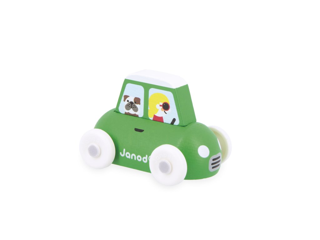 - Malé zelené mestské auto so zábavným buldogom na palube