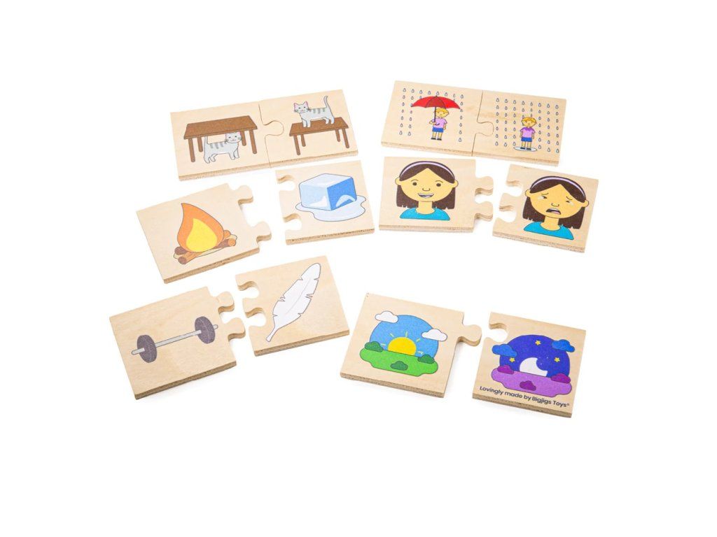 Dokážete dať dokopy správne protiklady? Naša skladačka „Protiklady“ učí deti o rôznych každodenných predmetoch a veciach, ktoré sú navzájom protikladmi. Čo je opakom smutného? Čo je opakom chladu?