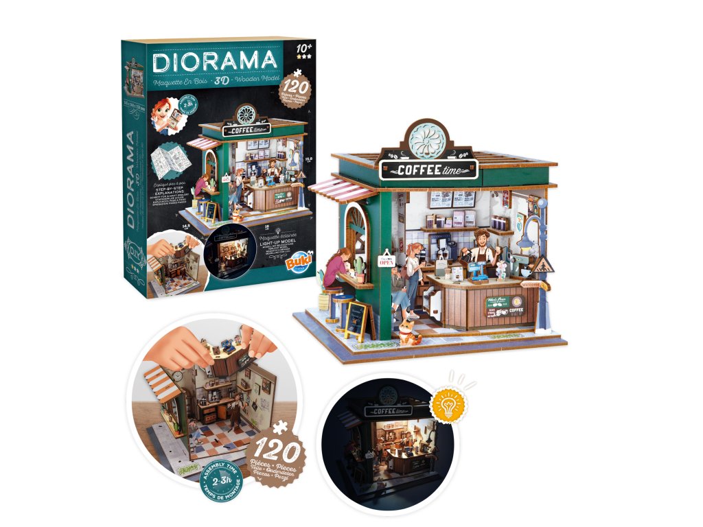 Zostavte drevené diely a postavte si vlastnú miniatúrnu kaviareň. Vytvorte si útulnú atmosféru pomocou detailne spracovaných prvkov – lepte, strihajte a umiestňujte nábytok, doplnky, rastliny aj zákazníkov presne podľa vašej predstavy. Vďaka očíslovaným dielom a prehľadnému návodu je skladanie jednoduché a zábavné.