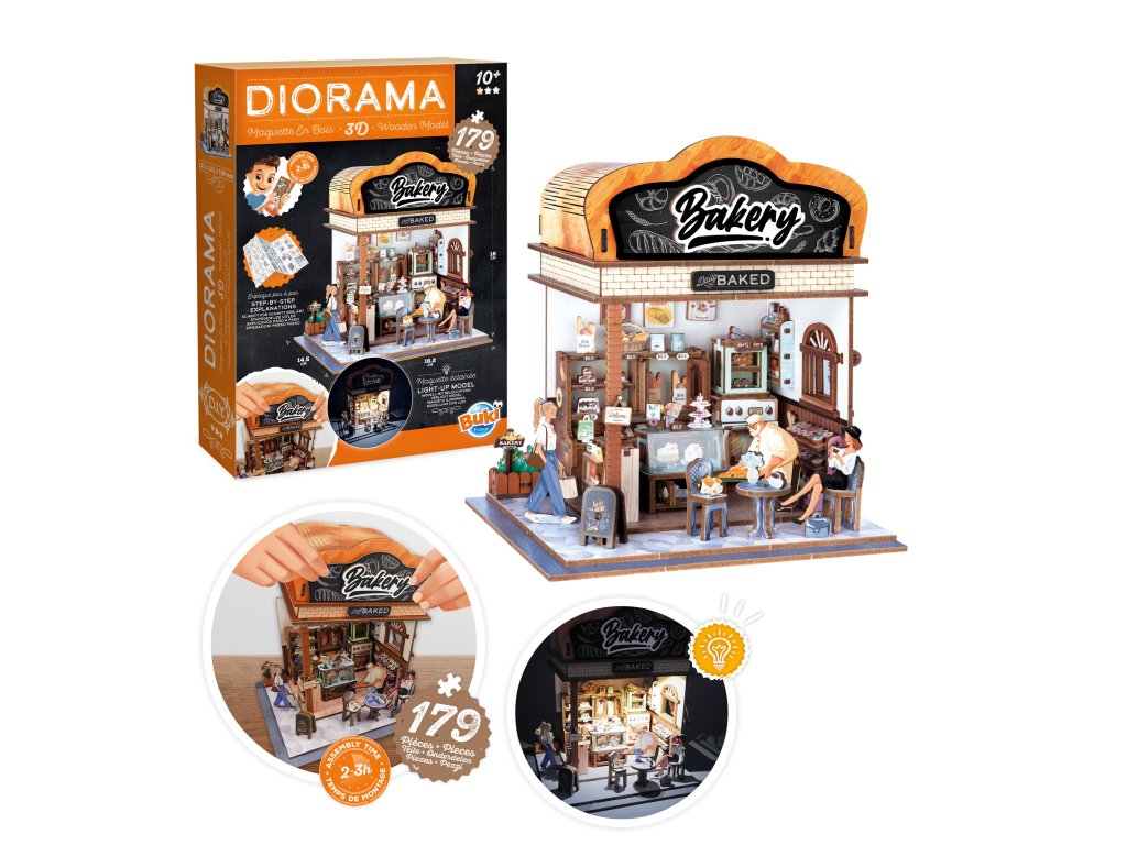 Zostavte drevené diely a postavte si vlastnú miniatúrnu pekáreň. Vytvorte si príjemnú a teplú atmosféru pomocou detailne spracovaných prvkov – lepte, strihajte a umiestňujte nábytok, doplnky, chutné pochúťky aj zákazníkov presne podľa vašich predstáv. Vďaka očíslovaným dielom a prehľadnému návodu je skladanie jednoduché a zábavné.