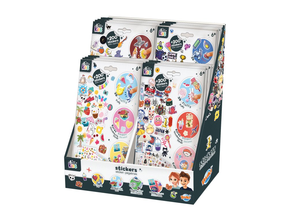 Displej so 4 modelmi balíčkov samolepiek. Ideálne riešenie pre predaj aj tvorivú zábavu – každý balíček obsahuje bohatý výber samolepiek v rôznych štýloch pre deti aj kreatívnych nadšencov.
