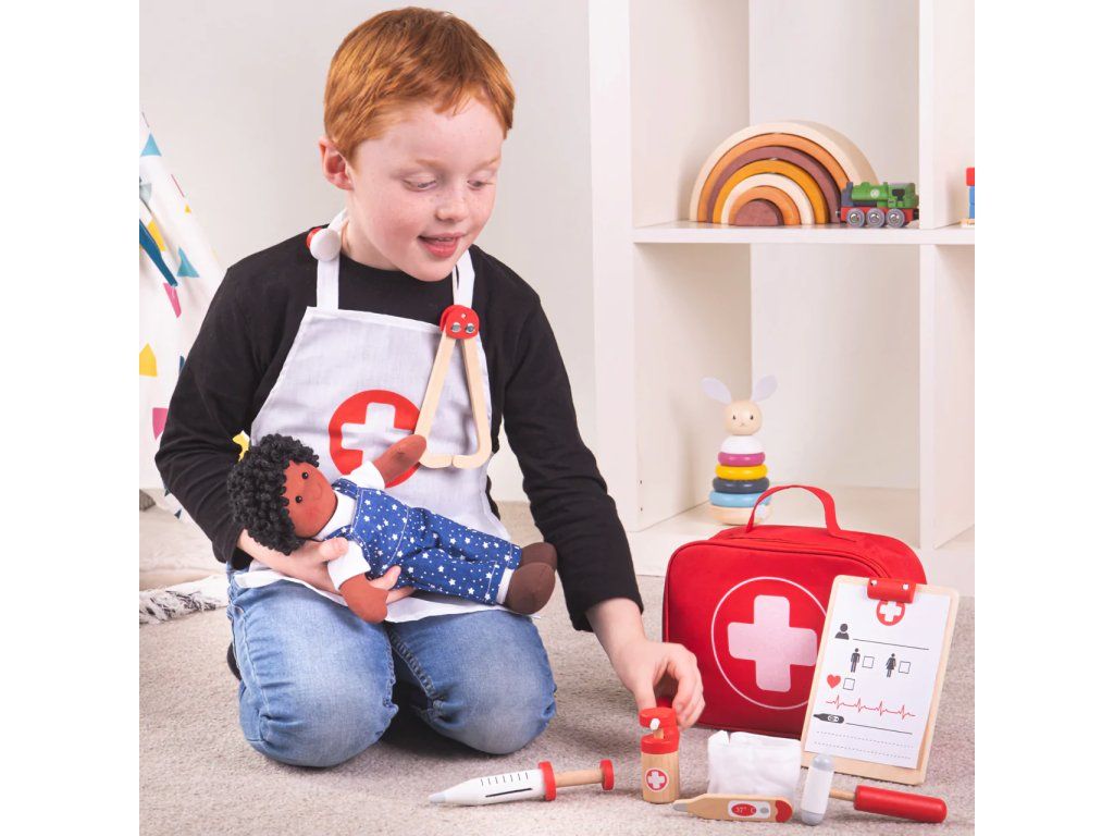 Praktická taška na prenášanie robí z tejto doktorskej sady skvelého spoločníka na cesty. Sada sa skladá z 10 hracích častí a je ideálna pre malé deti, ktoré sa radi hrajú na lekárov.