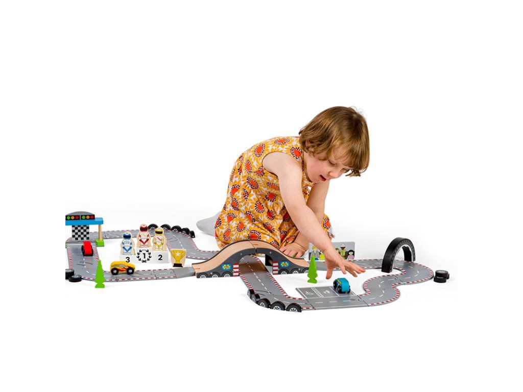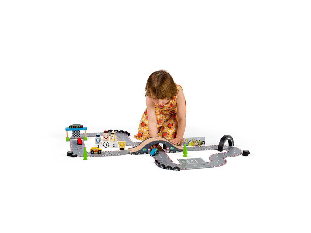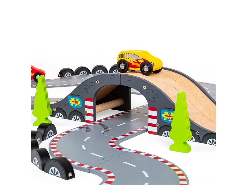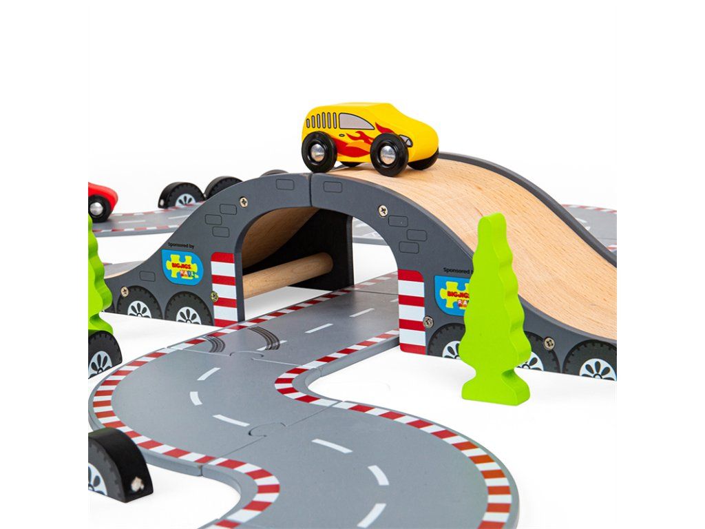 Pripraviť sa! Pozor! Štart! Táto fantastická drevená autodráha Závodný deň je ideálny darček pre každého malého pretekára alebo pretekárku. Obsahuje radu drevených cestných dielov, 3 pretekárske autá, štart/cieľ a ďalšie príslušenstvo, čo umožňuje dostatok priestoru pre zábavnú a kreatívnu hru. Dá sa použiť s ďalšími sadami Bigjigs Rail ciest a rozšíriť tak rôznorodosť herných aktivít. Kombinovateľná je aj so všetkými ostatnými drevenými cestnými sadami na trhu. Rozvíja koordináciu pohybov, jemnú motoriku, zručnosť a predstavivosť.