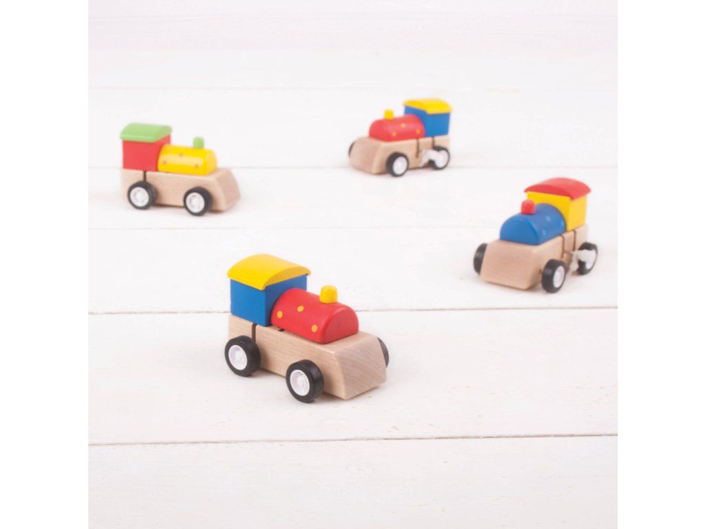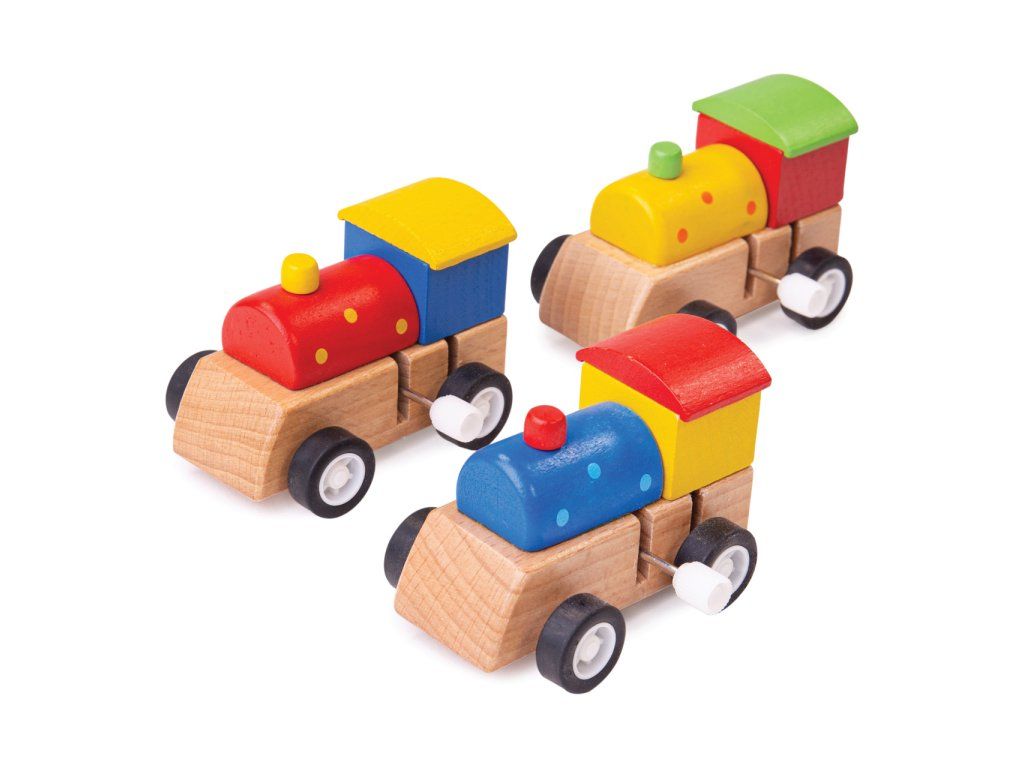 Drevené mašinky – hodiny zábavy! Hooo, hooo! Tieto tri pestrofarebné mašinky sú ideálnym darčekom pre každého malého železničného nadšenca. Deti si užijú hodiny zábavy, keď mašinky svištia po akejkoľvek ploche.