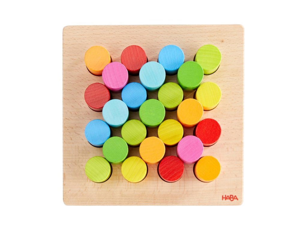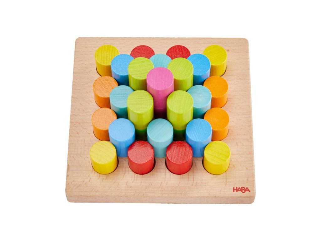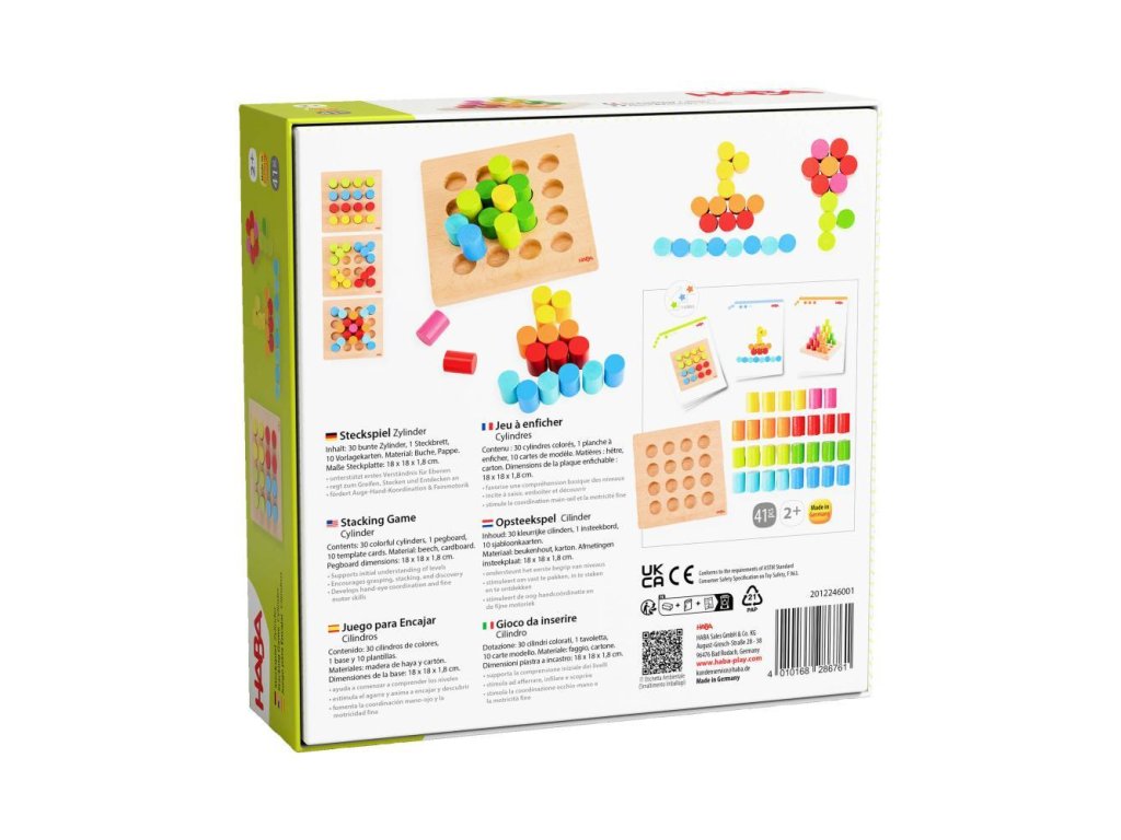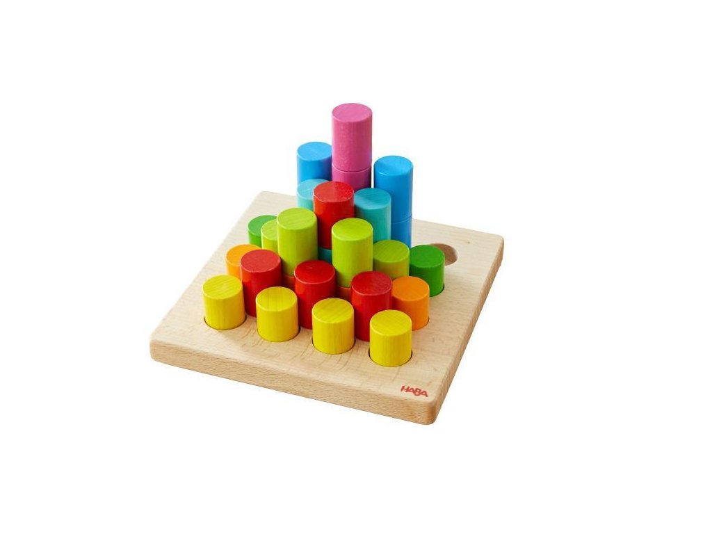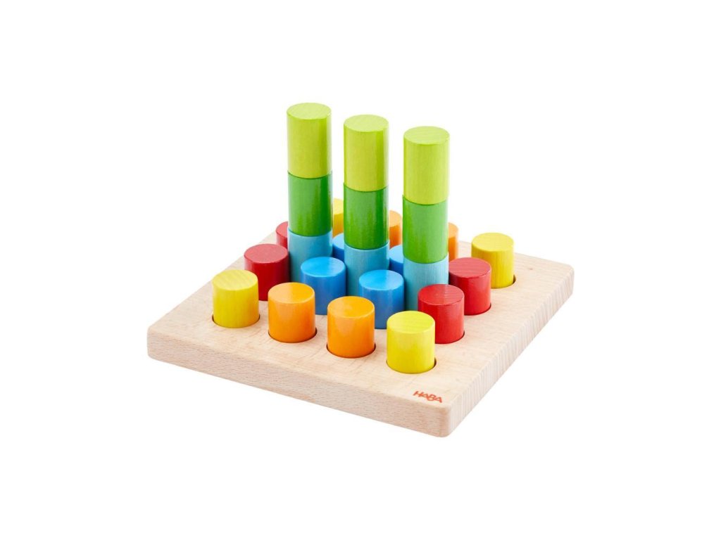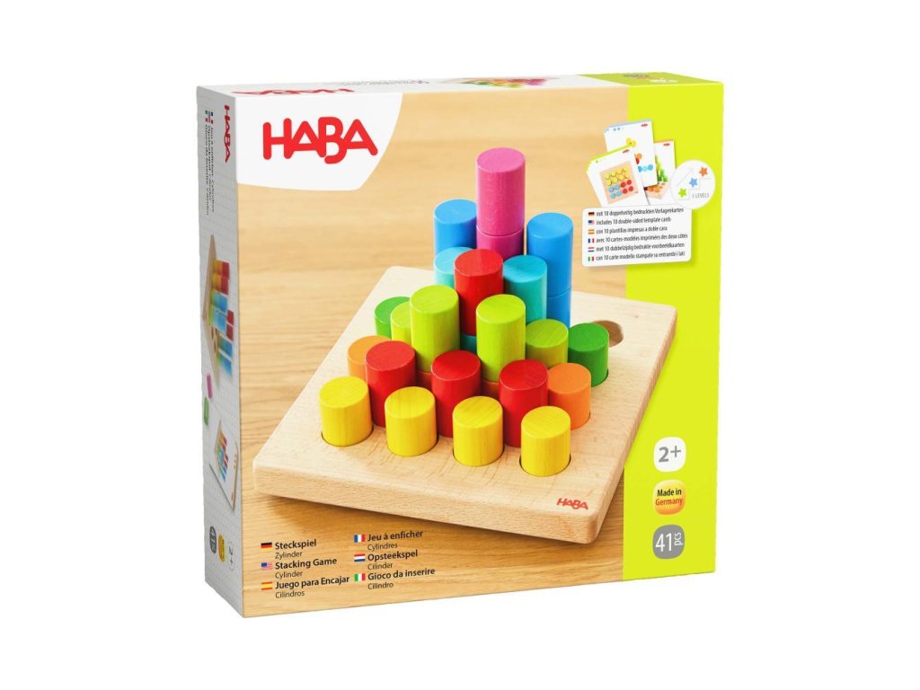 Stohovacie valce HABA – 3 úrovne obtiažnostiNa vrch drevenej dosky môžete umiestniť valce alebo z nich stavať farebné veže! 30 farebných valcov je možné umiestniť do mriežky 4x4, využívajúc 16 vopred vyrazených otvorov na doske podľa vlastnej fantázie. Pre pokročilejších sú k dispozícii 10 obojstranných kariet šablón s 3 úrovňami obtiažnosti – nielen radenie vedľa seba, ale aj stohovanie na rôznych úrovniach.