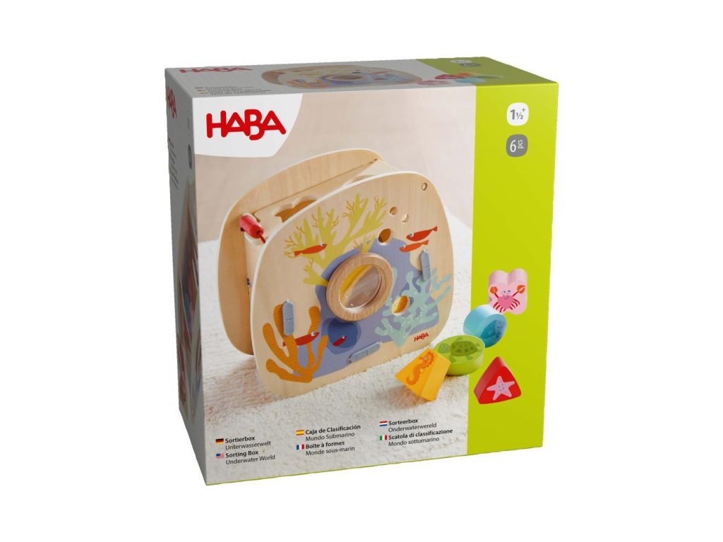 Triediaca krabica – podmorský svet HABAPozrite sa dovnútra a ponorte sa do farebného podmorského sveta! Deti spoznávajú tvary a farby pomocou piatich drevených kociek – každá kocka má svoj jediný správny otvor. Vyskúšaním a pozorovaním sa učia priraďovať tvary a farby. Malé okienko umožňuje nahliadnuť dovnútra a sledovať farebný podmorský život. Klapka je ľahko otvárateľná pre jednoduchú hru.