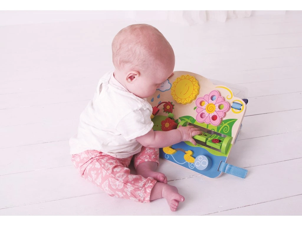 Drevená doska má nastaviteľné úchyty a je možné ju pripevniť aj k postieľke, čím sa z nej stáva praktická a bezpečná hračka pre bábätká od 6 mesiacov. Vyrobená je z vysoko kvalitných, zodpovedne získaných materiálov a spĺňa aktuálne európske bezpečnostné normy.