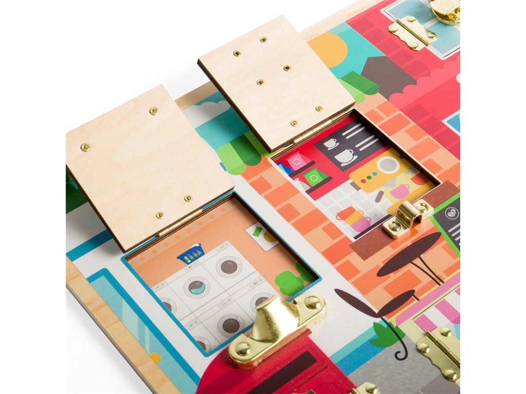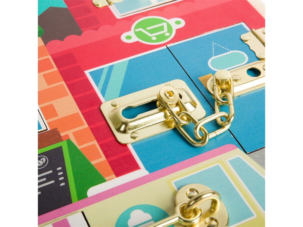 Zamestnajte svoje ratolesti s touto motorickou doskou so zámkami a západkami. Malé ručičky sa môžu hravou formou naučiť používať rôzne mechanizmy, ako je preklápacia západka, závora, pánty, reťazový posuvný zámok, západka na visiaci zámok, otočná západka či háčik so slučkou. Za každým z týchto Montessori zámkov sa deti môžu „preniesť“ do inej miestnosti či prostredia – práčovne, kuchyne, kaviarne, útulnej obývačky a ďalších. Hra tak prirodzene rozvíja fantáziu aj zvedavosť. Montessori hračka pomáha rozvíjať jemnú motoriku, koordináciu ruka–oko, logické myslenie a zručnosť. Doska je vyrobená z kvalitných a zodpovedne získaných materiálov.Obsah balenia: