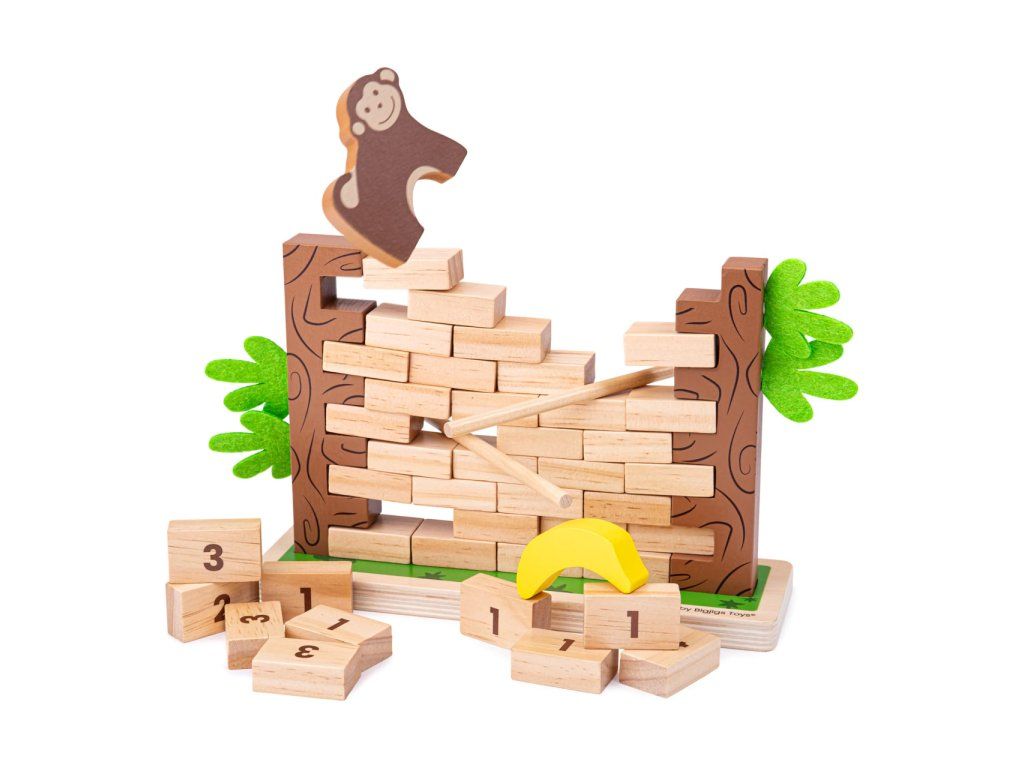 Oživte klasickú motorickú hru o jednoduché počítanie a objavte Rúcajúcu sa džungľu! Hra pomáha deťom rozvíjať nielen koordináciu ruka–oko a zručnosť, ale aj základy matematiky hravou formou. Na začiatku hráči zostavia stenu z dielikov rôznych hodnôt, otočených číslom nadol, aby ich nebolo vidieť. Na vrch steny sa umiestni opička a banán. Hráči sa striedajú v vytláčaní dielikov pomocou tyčiniek tak, aby sa celá stavba nezrútila. Víťazom sa stáva hráč, ktorý nespôsobí zrútenie steny a zároveň získa viac bodov. Hra je vyrobená z kvalitnej preglejky a masívneho dreva zo zodpovedných zdrojov.Obsah balenia: