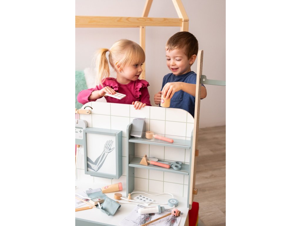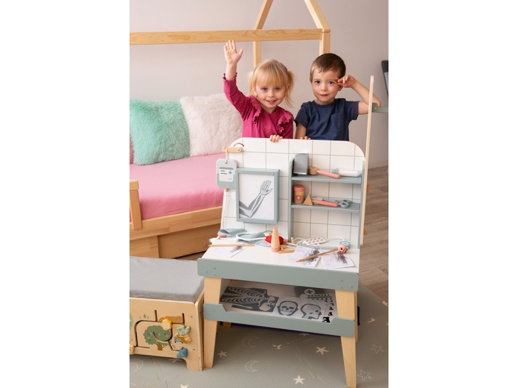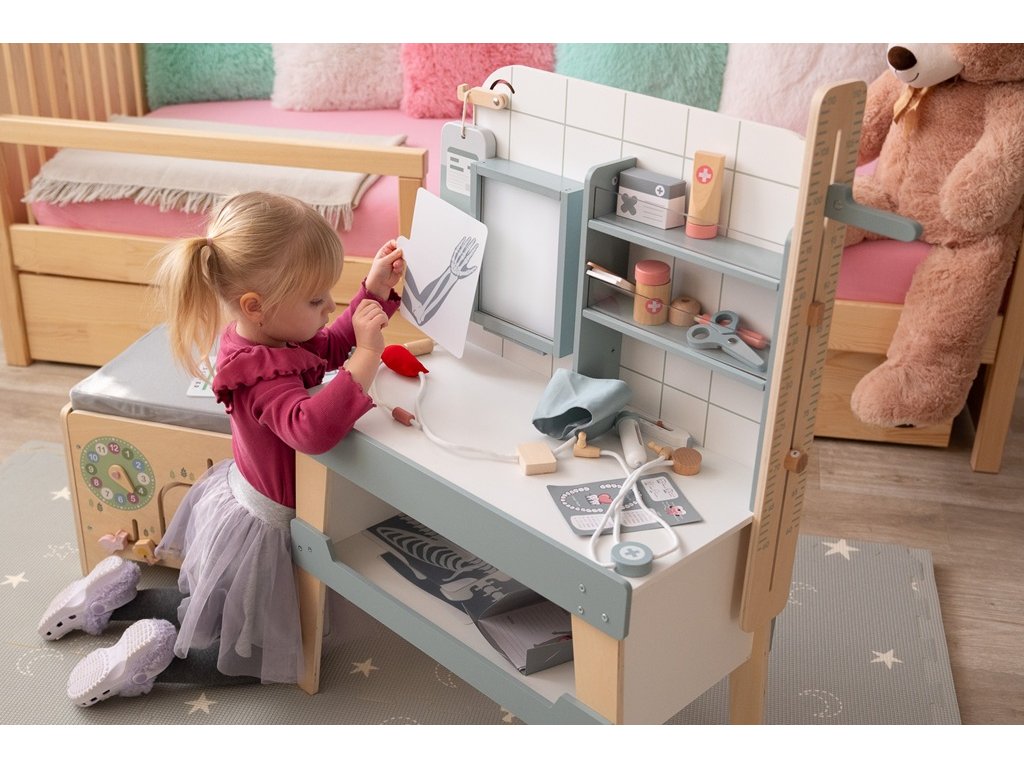 Deti si môžu vyskúšať meranie výšky pacienta, tlaku či teploty, „vyšetriť“ ho, zapísať údaje do karty pacienta alebo skontrolovať zrak a sluch. Nechýba ani funkčná podsvietená doska na prezeranie röntgenových snímok, ktorá robí hru ešte realistickejšou.