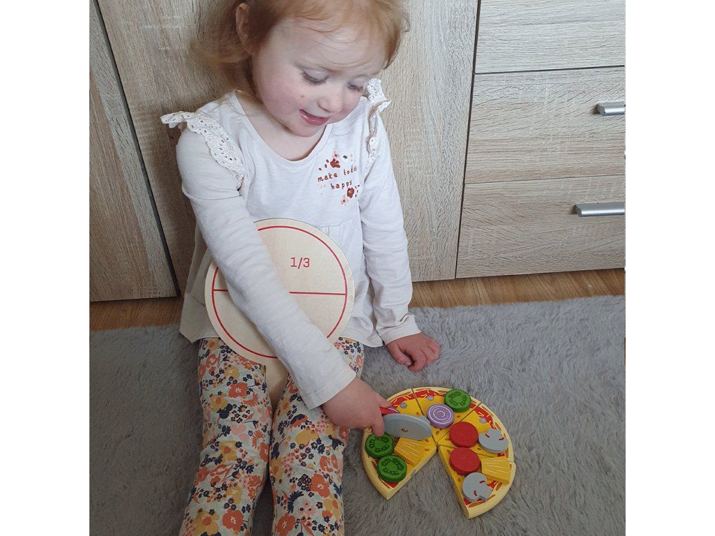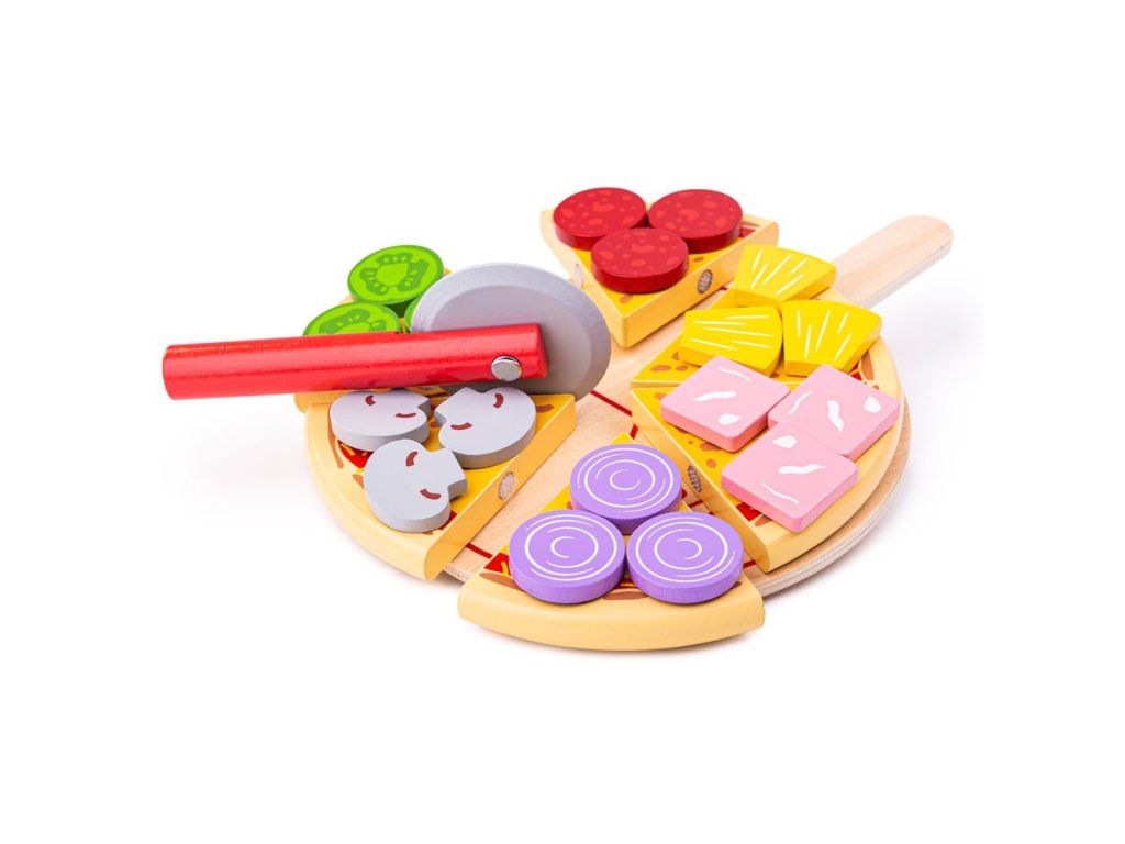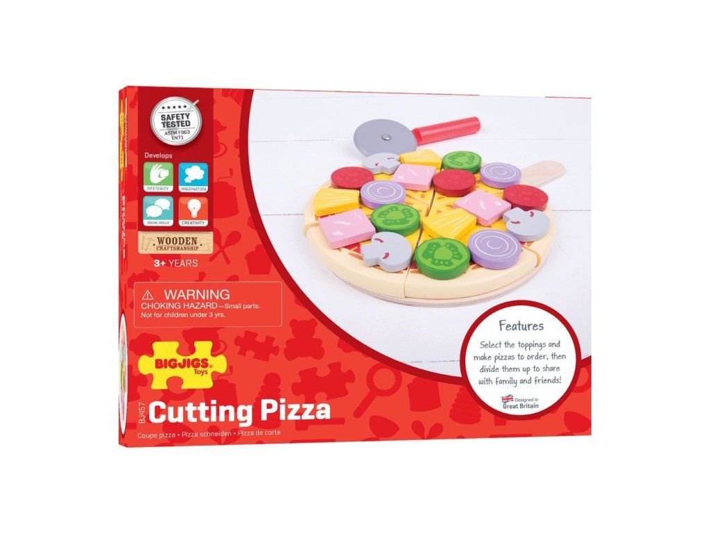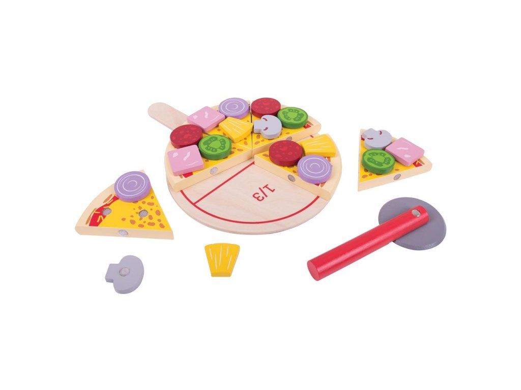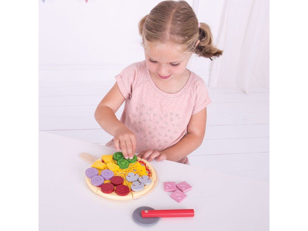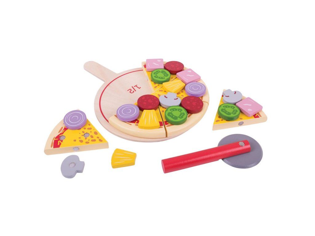 Šesť lahodných plátkov drevenej pizze s rôznymi ingredienciami ponúka deťom množstvo možností na kreatívnu hru. Deti si môžu vybrať suroviny a pripravovať pizzu na objednávku pre rodinu či kamarátov, čím si prirodzene rozvíjajú fantáziu aj sociálne zručnosti. Pizzu je možné krájať dreveným krájačom a servírovať na drevenej podložke alebo na jedálenskej sade Bigjigs Toys (BJ617). Súprava podporuje aj učenie sa hravou formou – na podložke sú naznačené zlomky, ktoré pomáhajú rozvíjať základné matematické schopnosti. Hra vedie deti k pochopeniu zdravej a vyváženej stravy, učí ich, odkiaľ jedlo pochádza a ako sa pripravuje. Vyrobené z kvalitných a zodpovedne získaných materiálov, spĺňa aktuálne európske bezpečnostné normy.Obsah balenia: