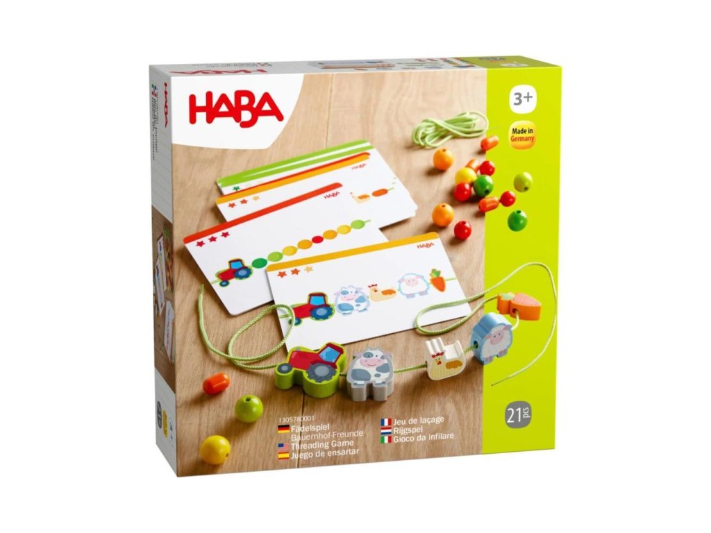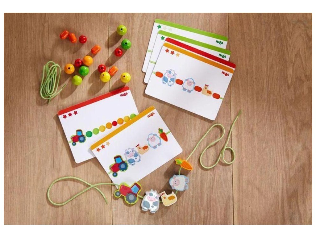 HABA Farm Friends – navliekacia hraObjavte svet farmy hravou motorickou aktivitou! Hra na navliekanie HABA Farm Friends obsahuje 21 drevených kameňov a 2 navliekacie šnúry, s ktorými si deti od 3 rokov môžu vyskladať zábavnú reťaz farmárskych kamarátov podľa vlastnej fantázie alebo podľa predloh na 6 obojstranných kartách.