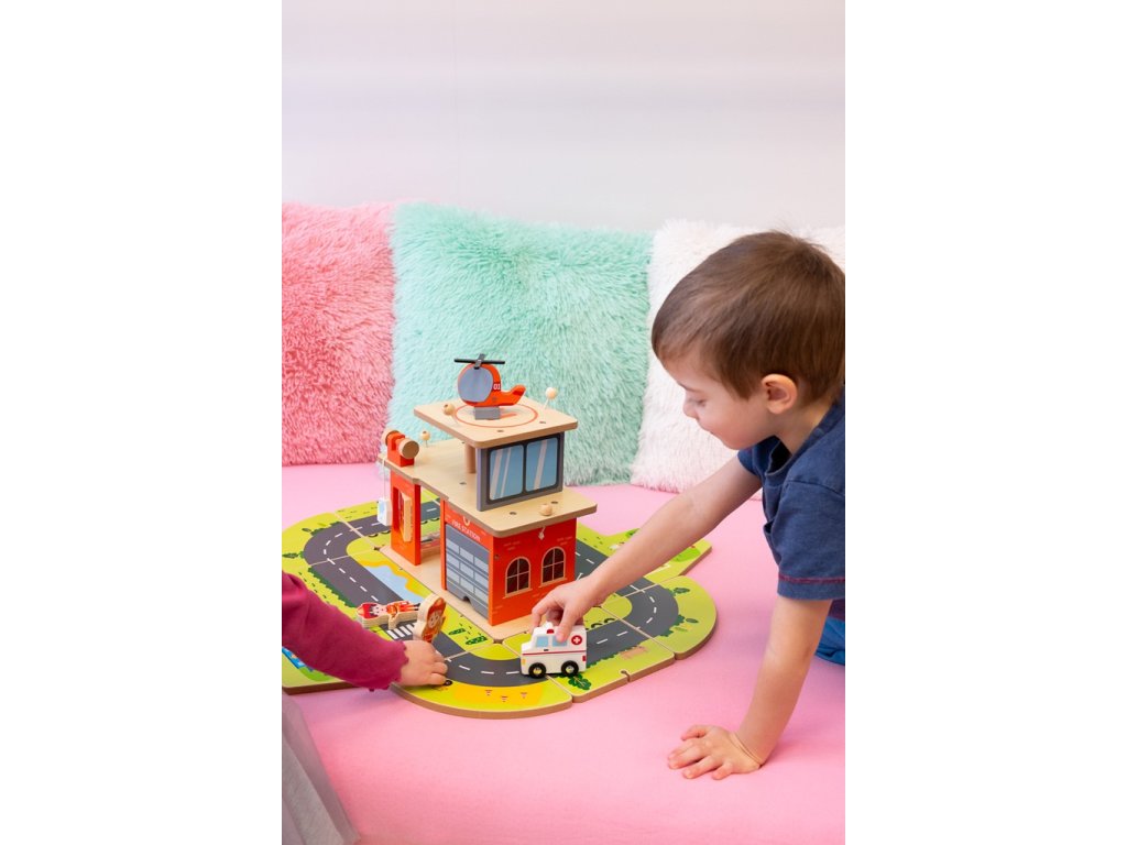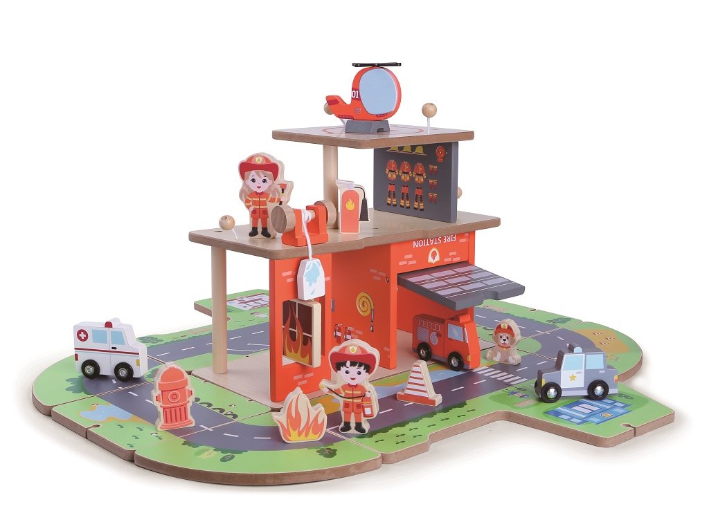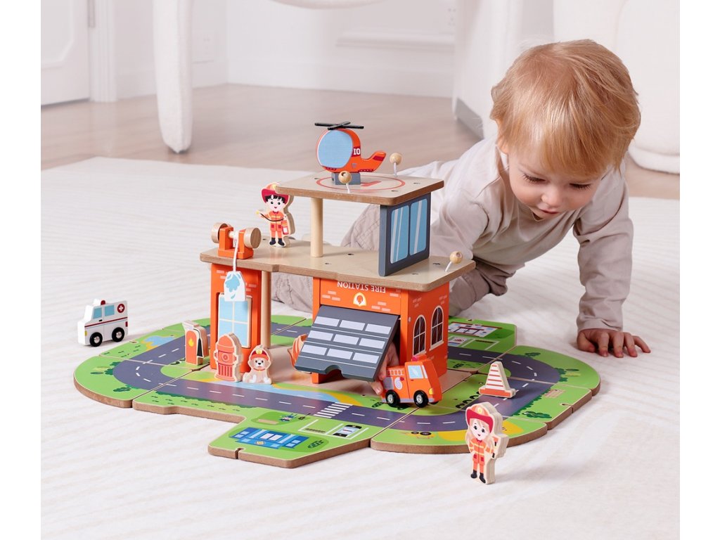 Detailne spracovaná hasičská stanica obsahuje výjazdové brány, cestu, riadiace centrum, parkovacie miesta aj záchranárske vybavenie pripravené na každú núdzovú situáciu. Súčasťou sú aj figúrky hasičov, vozidlá, psík a ďalšie doplnky. Vďaka chytrému dizajnu je možné stanicu jednoducho zložiť a premeniť na hasičské auto, ktoré môže okamžite vyraziť k zásahu.